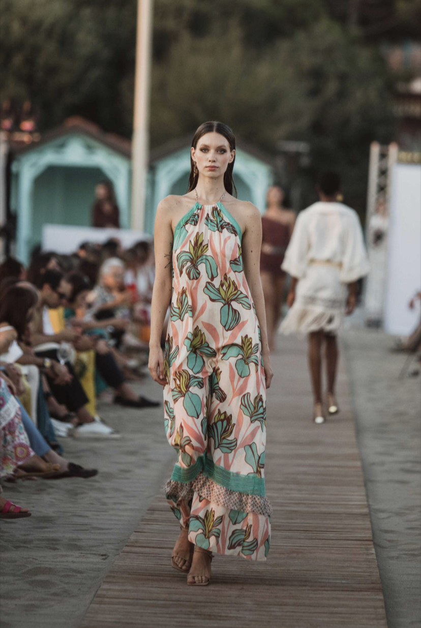 L’abito ha una stampa di macro fiori su fondo avorio, dettagli di pizzo color acqua impreziosiscono lo scollo e la balza sulla lunghezza dell’abito.