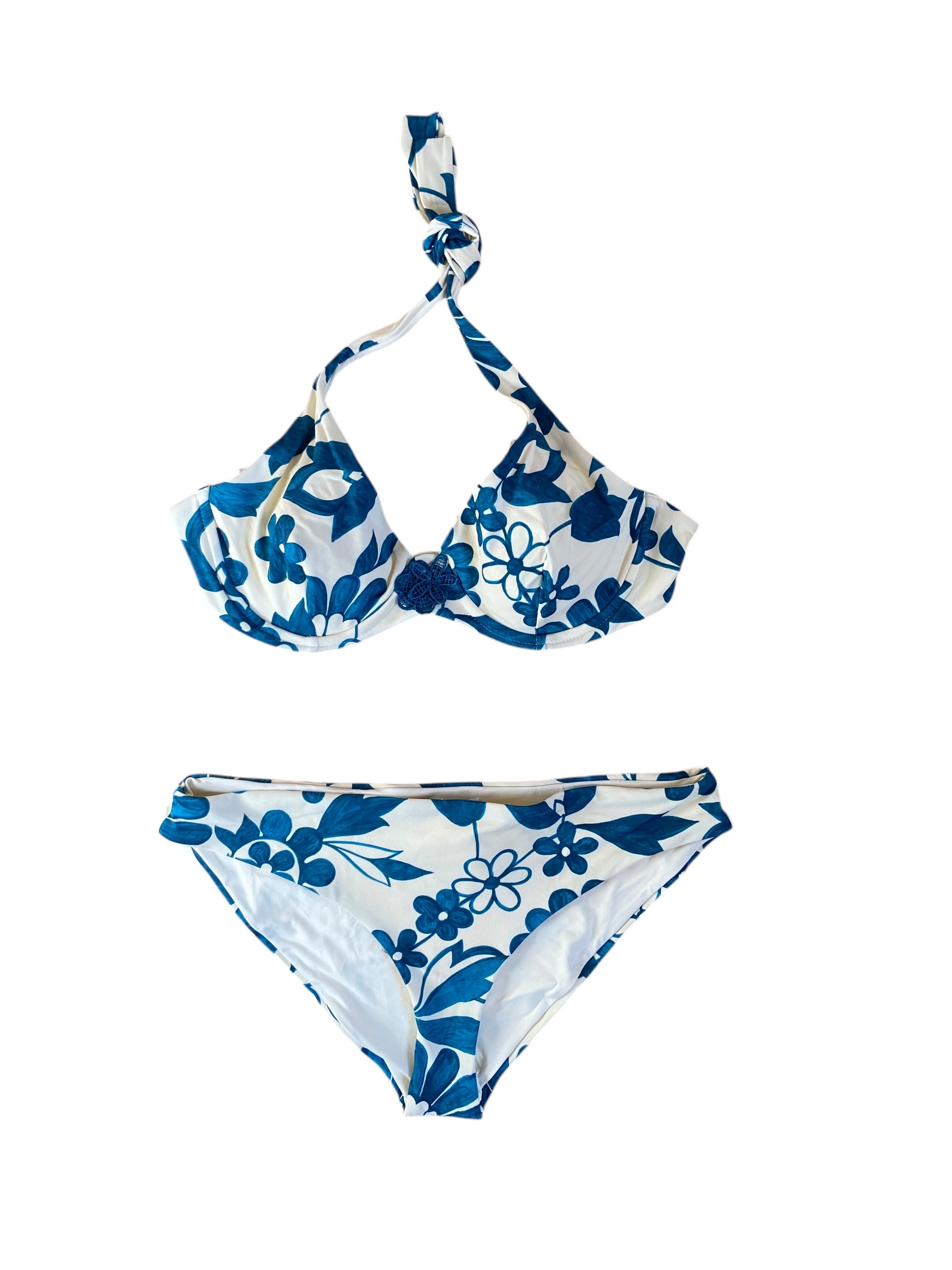 Bikini con ferretto coppa/C con stampa color pavone su fondo avorio slip altezza media coprente.