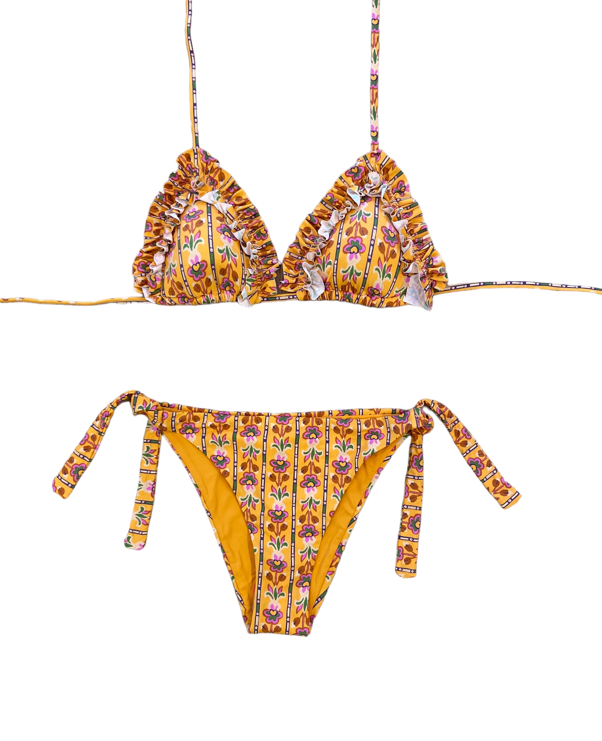 Bikini con reggiseno a triangolo scorrevole con imbottitura estraibile, micro stampa su fondo giallo ocra e rouche.