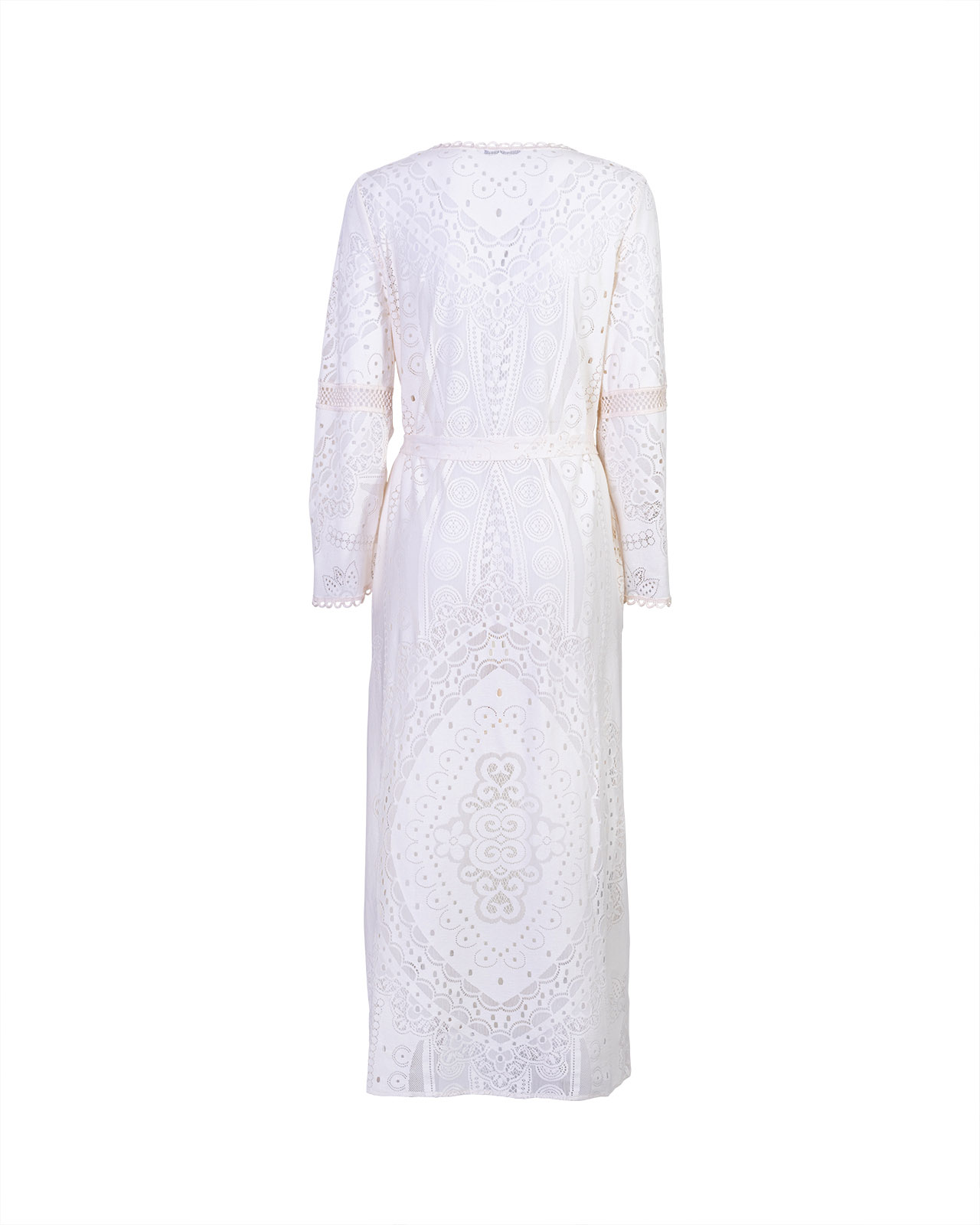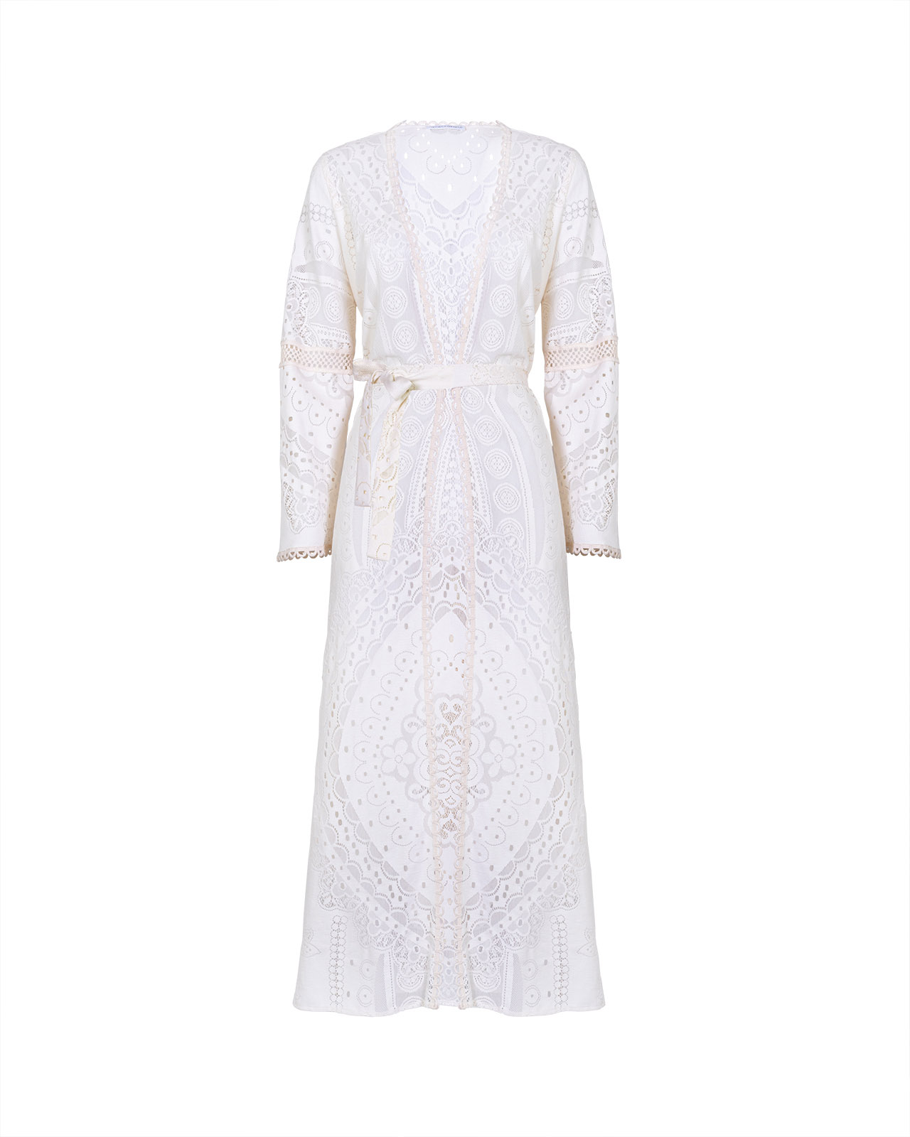 Caftano lungo in pizzo avorio, manica lunga,ย aperto davanti con cintura da annodare in vita.