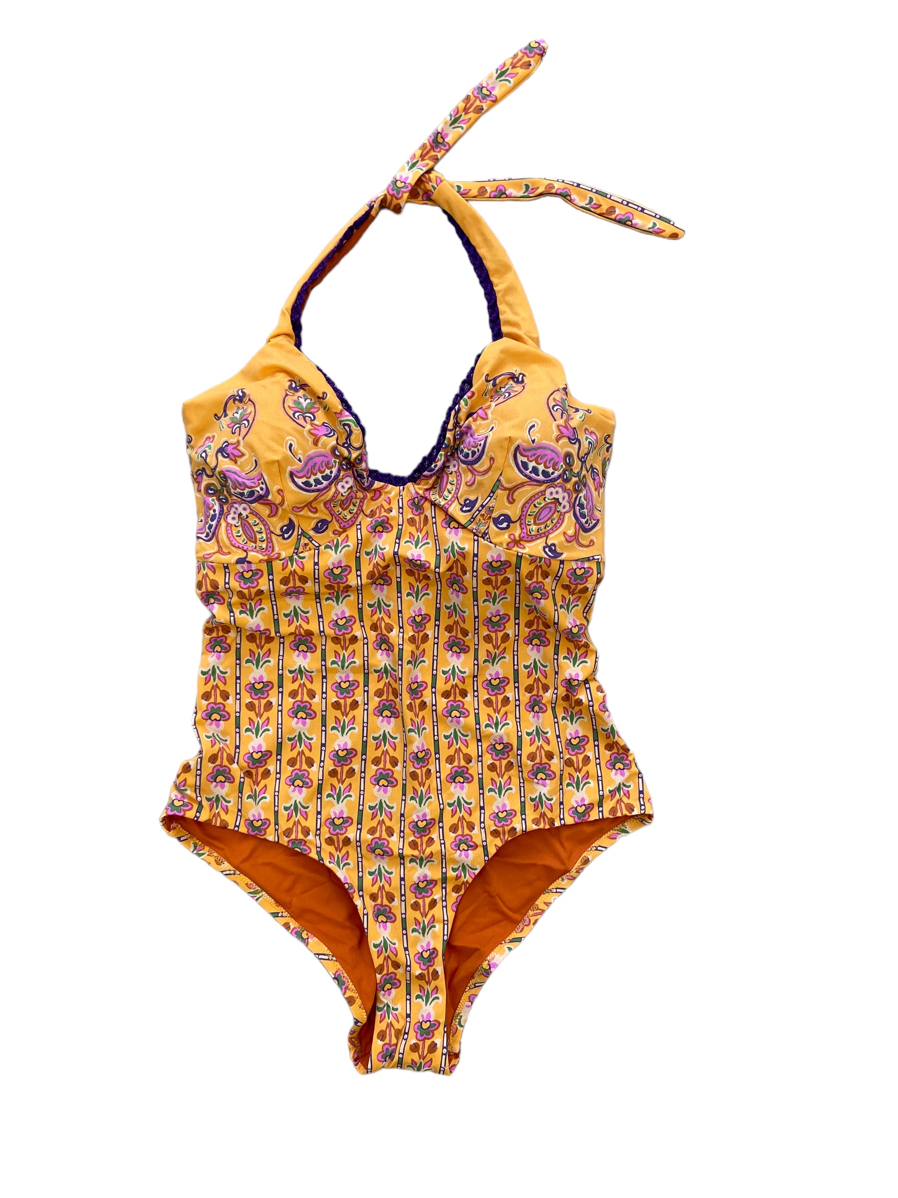 Costume intero con ferretto coppa C allacciato dietro il collo, poco scollato dietro. Microstampe e dettagli di passamaneria in contrasto colore impreziosiscono questo costume adatto per seni generosi.