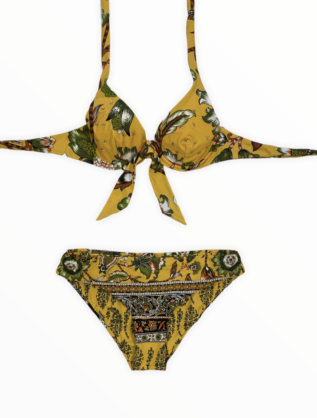 Bikini macro stampa di fiori stilizzati, reggiseno con ferretto. Allacciatura regolabile con nodo dietro la schiena in base a circonferenza torace.