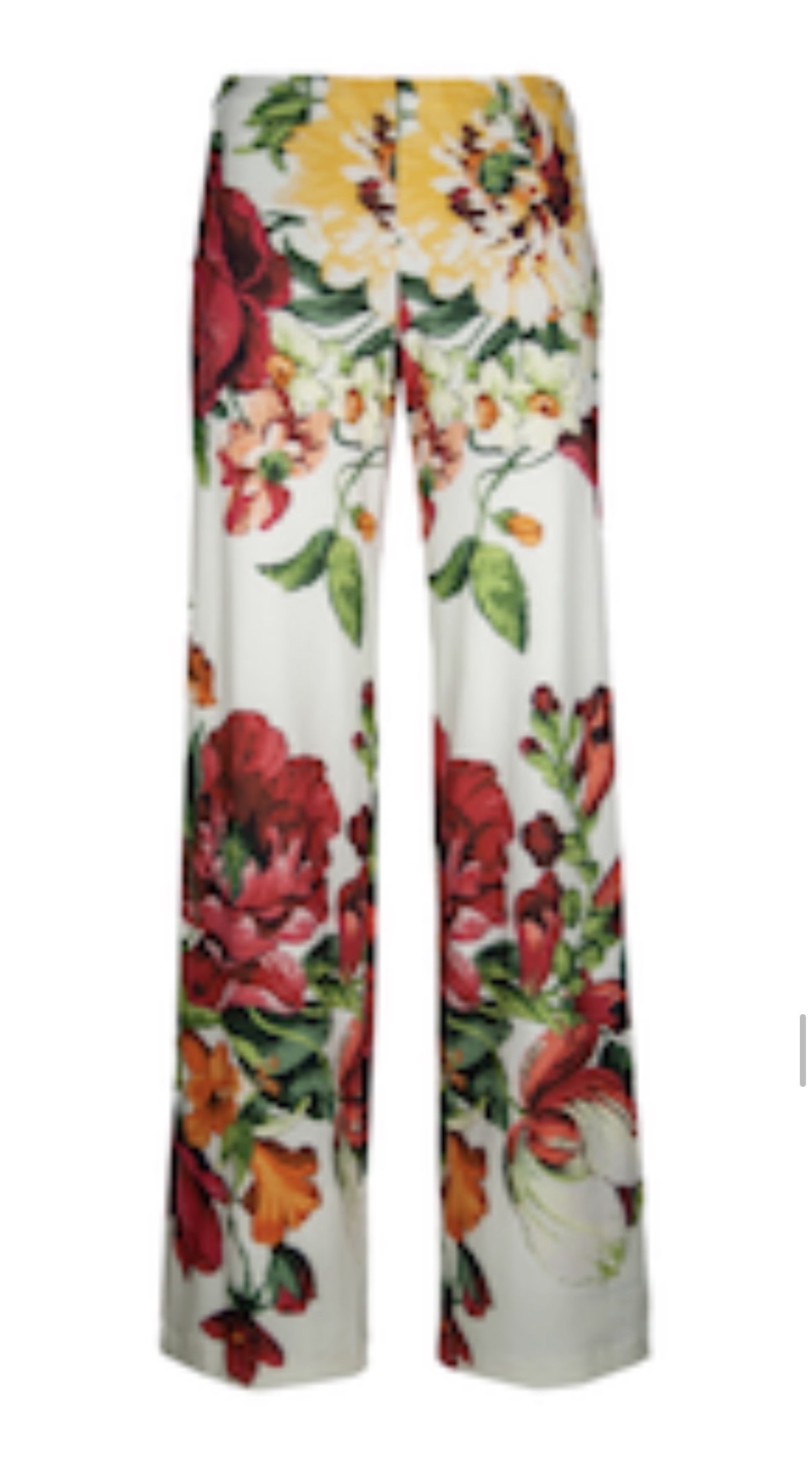 Pantalone palazzo in Lycra stampa floreale su fondo avorio, elastico in vita.