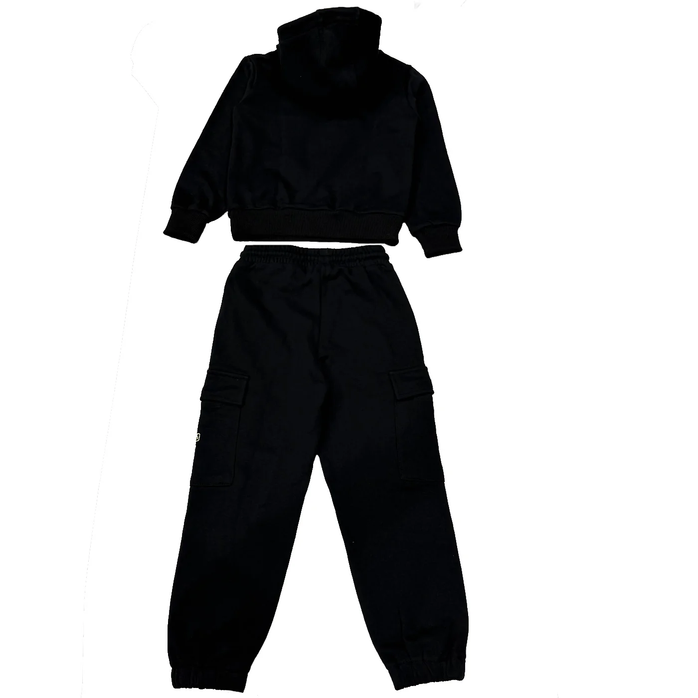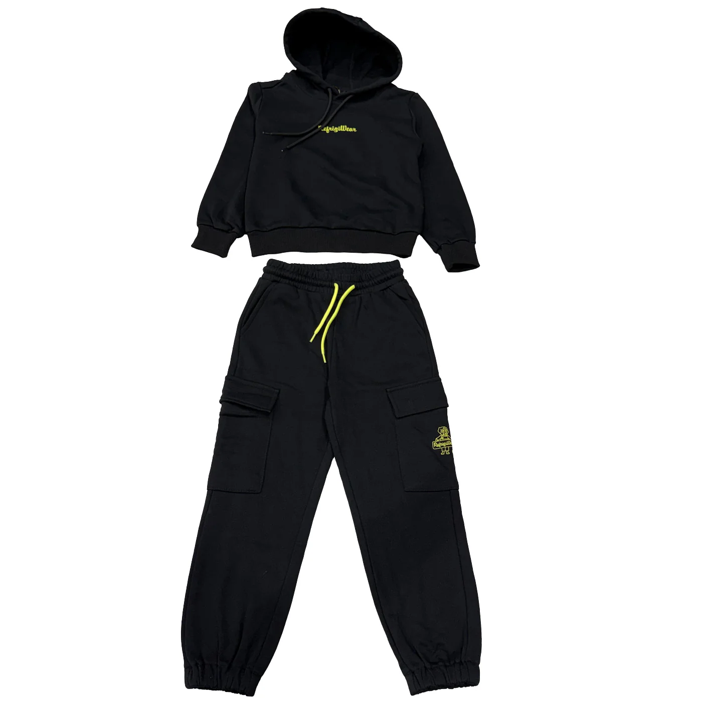 Refrigiwear tuta due pezzi bambino in cotone garzato nera Felpa con cappuccio Logo frontale Polsini e fondo a coste Pantalone tuta cargo Vita elastica con coulisse regolabile Tasche a filo Tasconi laterali con logo Fondo elasticoComposizione: 51,3% cotone 48,7% poliestereMade in CinaCollezione Autunno Inverno Vestibilitร :Taglia Etร