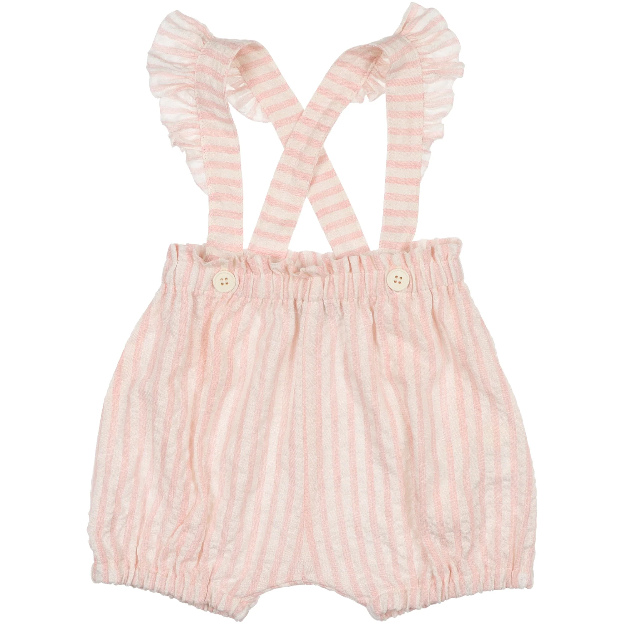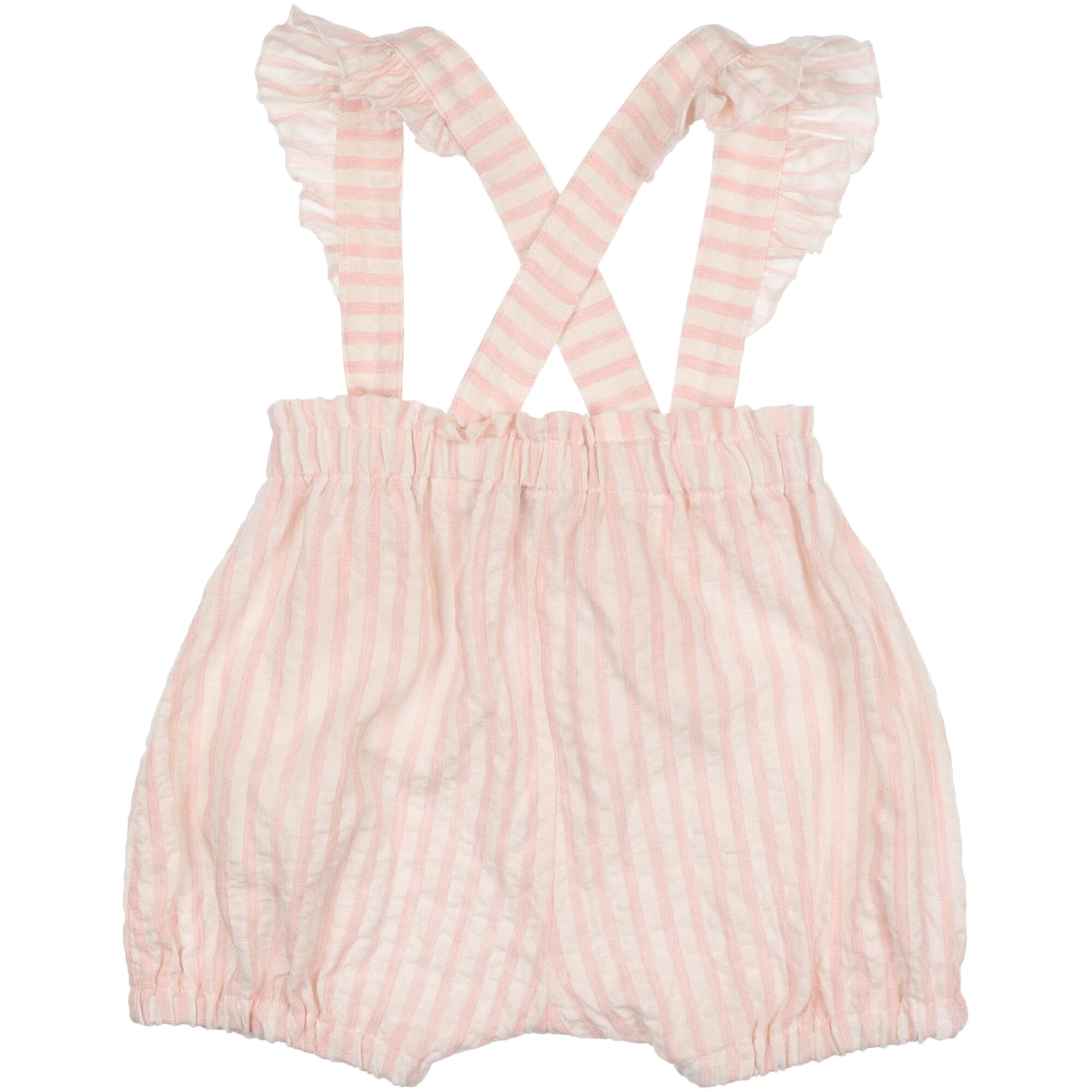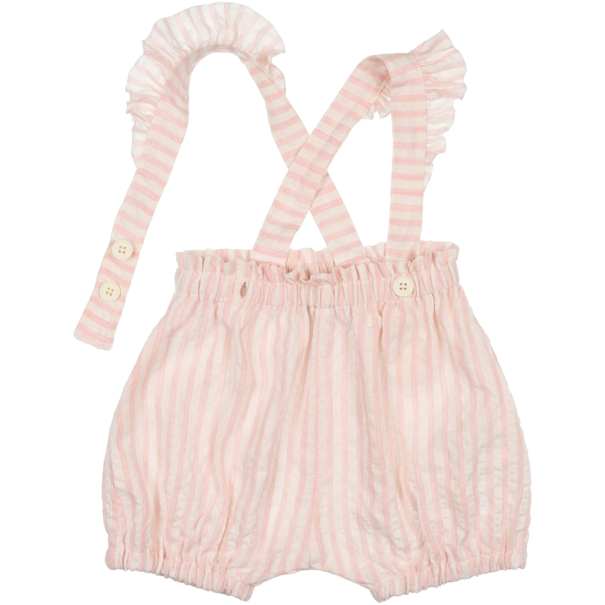 Salopette in cotone a righe tessuto effetto stropicciato morbido e liscio, taglio in vita con rouches, scollo rotondo, senza maniche, apertura dietro con bottoni ed occhielli. Corpetto foderato completo di coulotte. Autentica manifattura italiana.