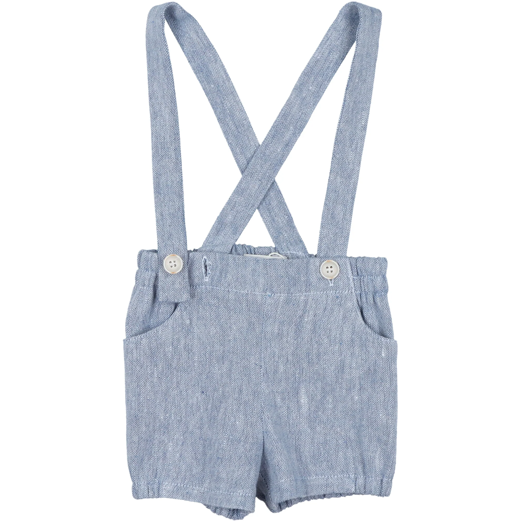Short in misto lino effetto denim con bretelle fissate davanti con bottoni, tasche aperte, elastico in vita e sull’orlo dietro per una migliore vestibilitร .