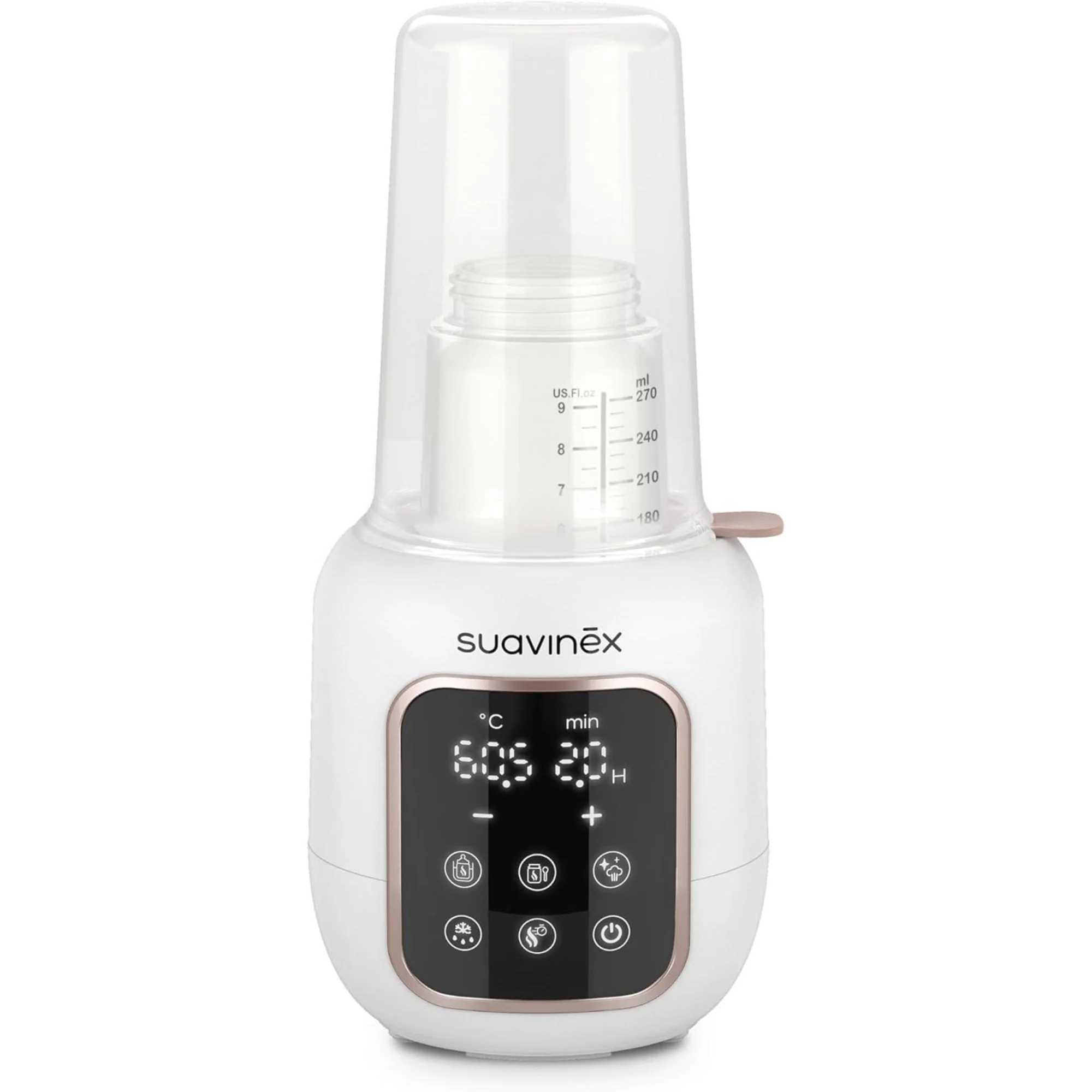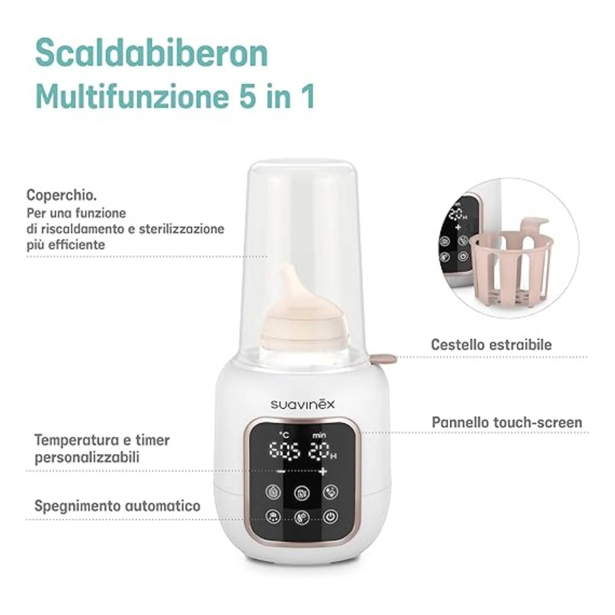 Sterilizza biberon e ciucci, riscalda e scongela latte (materno o formula) e pappe. 5 programmi automatici: vapore rapido, pappa, bagnomaria, scongelamento e sterilizzazione. Touch screen, spegnimento automatico, timer e segnale acustico. Riscaldamento delicato per preservare i nutrienti del latte materno. Adatto a contenitori in vetro e plastica.