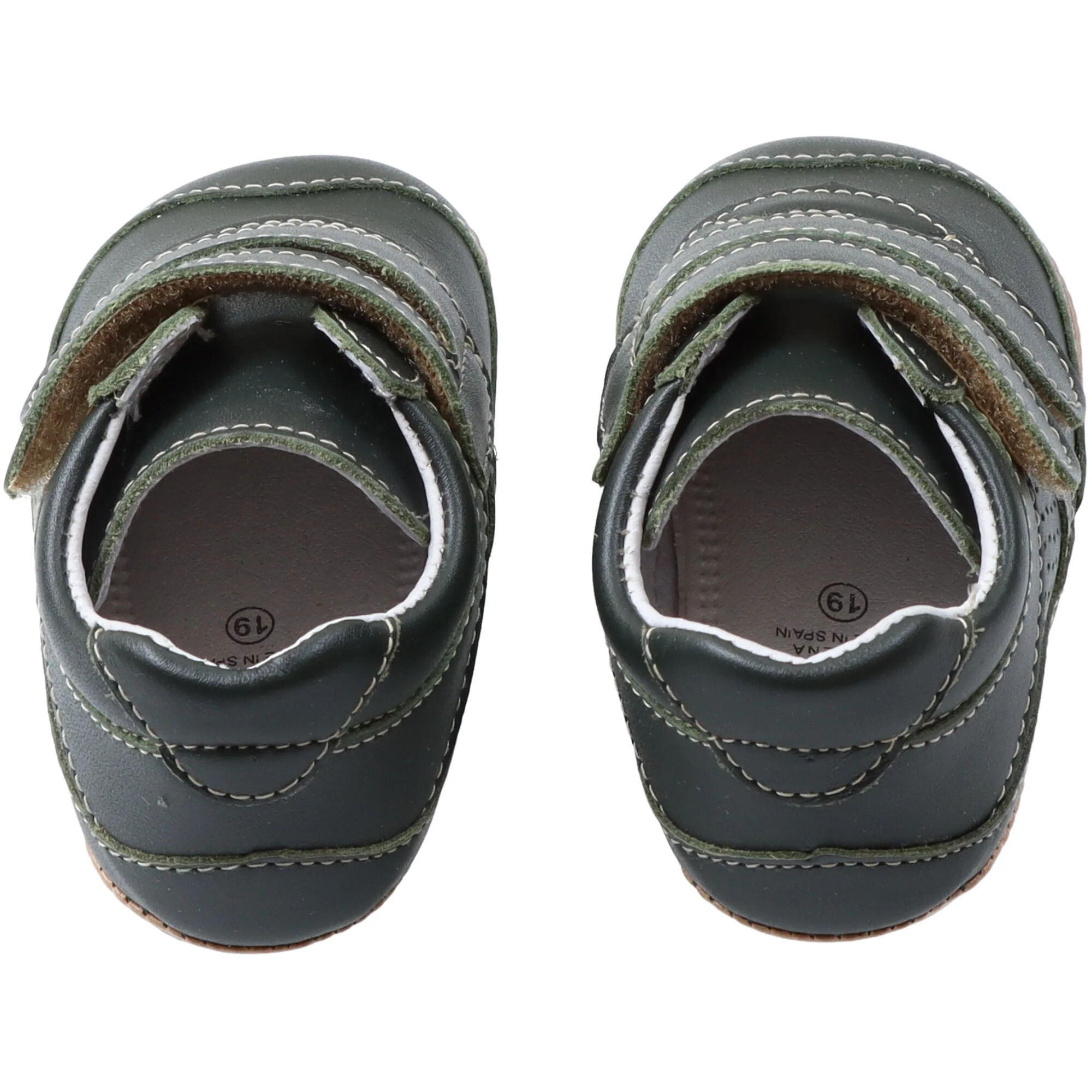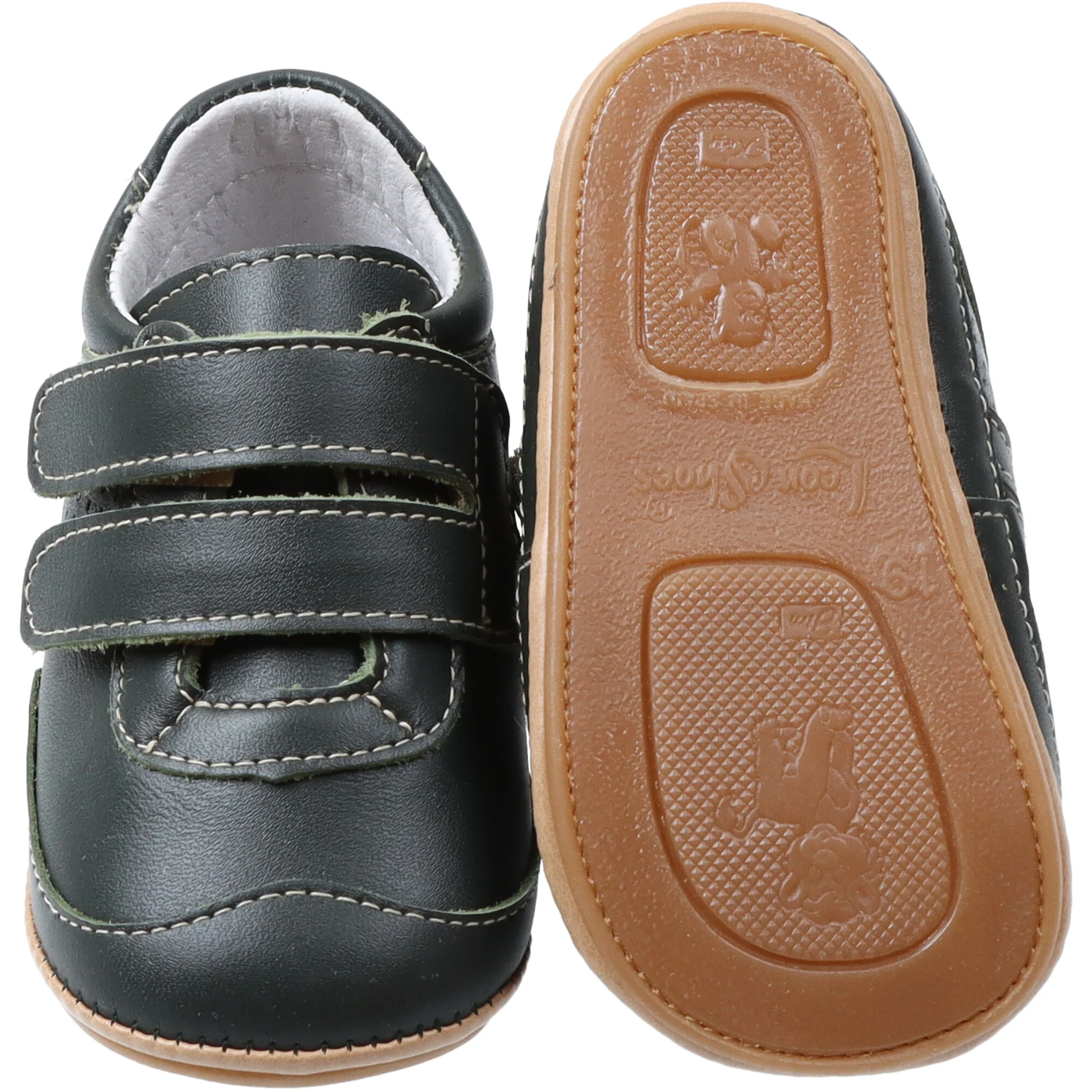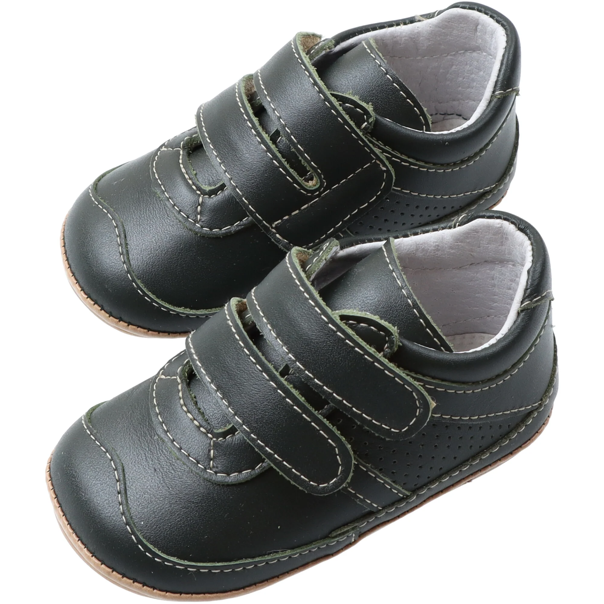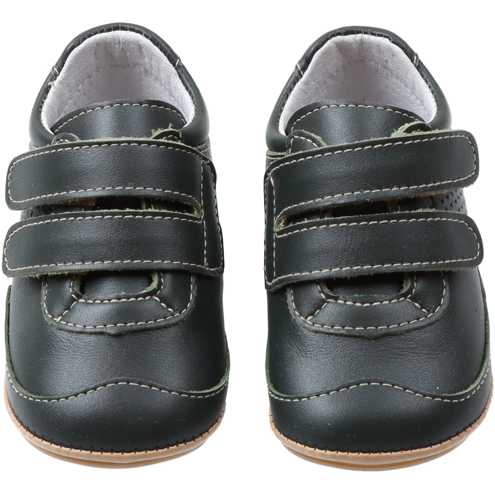 Calzature in pelle con cuciture a contrasto, confortabile e durevole. Rinforzo sul retro della scarpa. Solette antiscivolo. Estremitร arrotondate, Chiusura comodo velcro.