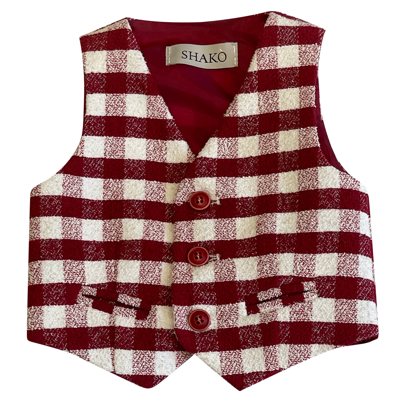 Shakò gilet panciotto neonato cotone panna bordeaux Fantasia quadri Chiusura a tre bottoni Composizione: 95% cotone 5% elastan Made in Italy Collezione Primavera Estate Vestibilità:Taglia Età