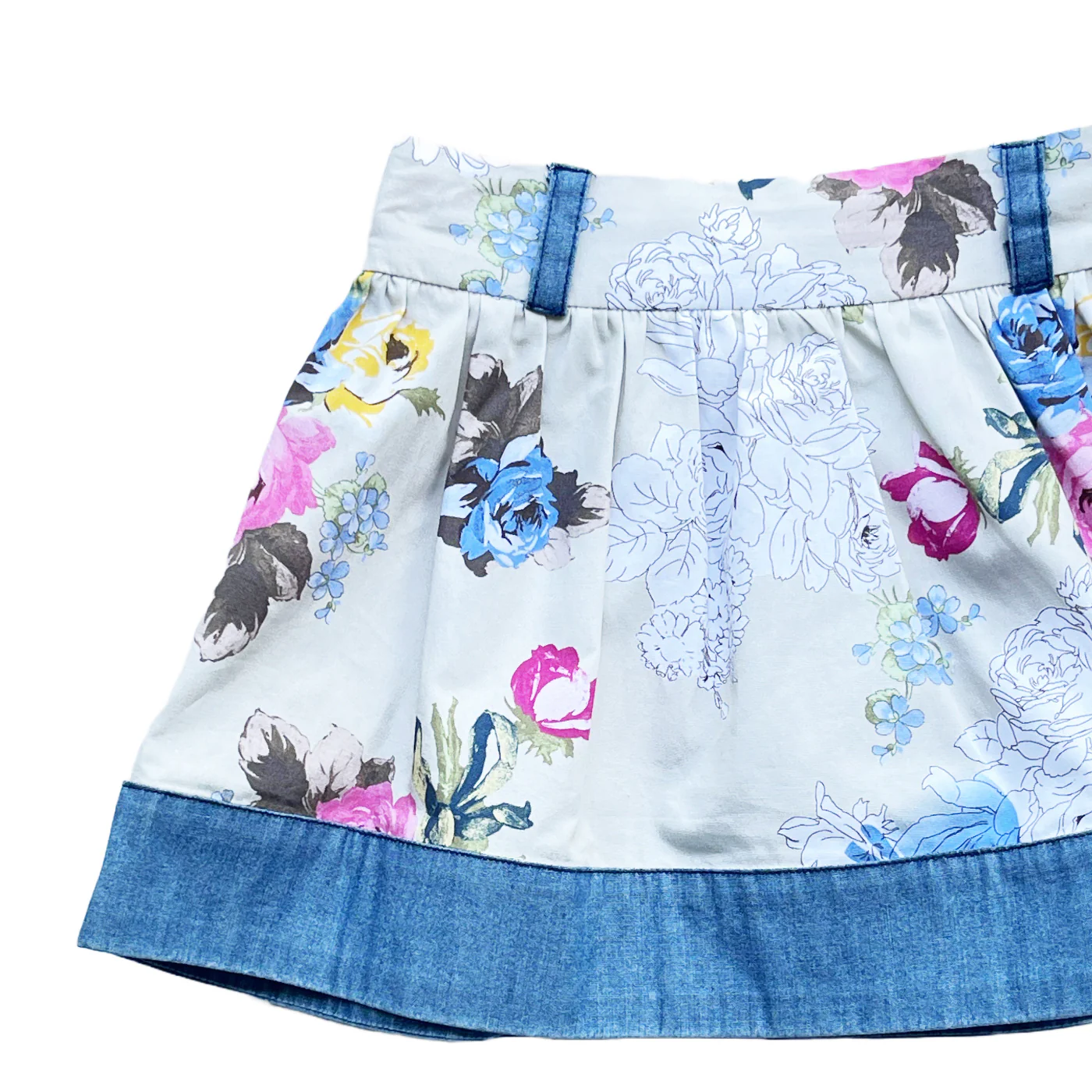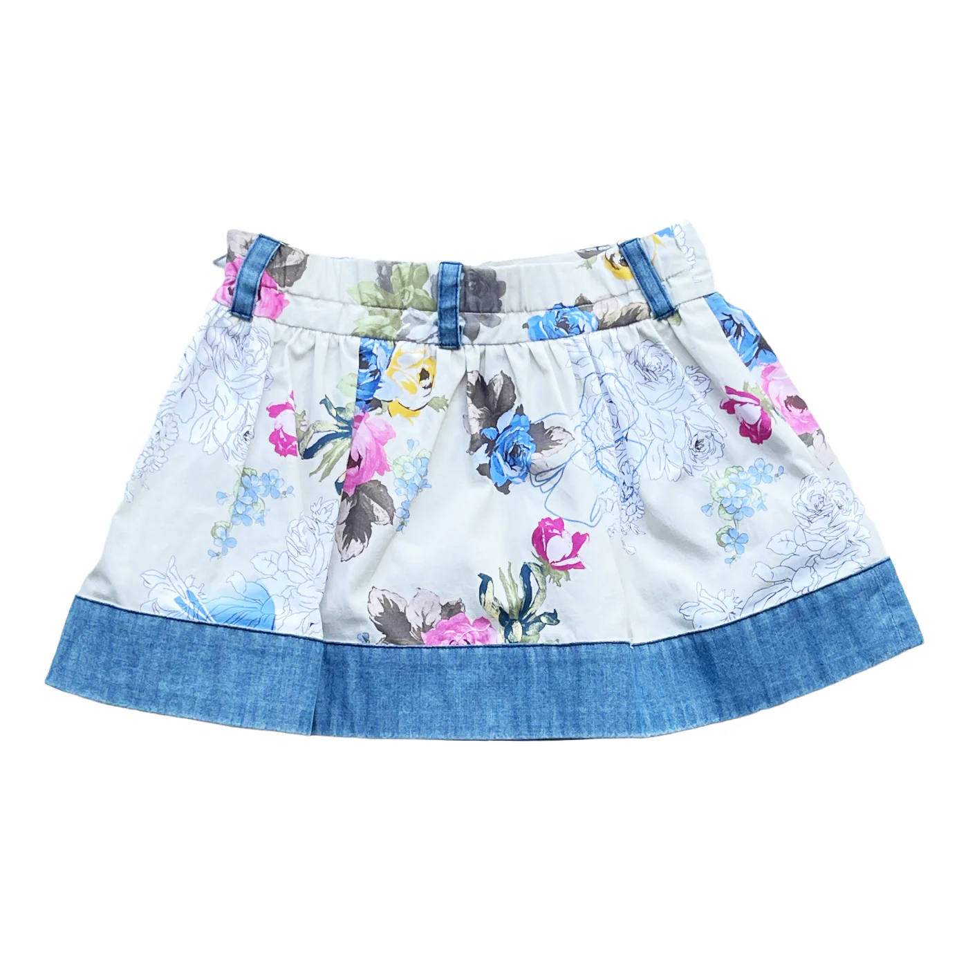 Simonetta gonna bambina cotone bianca fantasia Vita con passanti in jeans Chiusura con cerniera Fondo in jeans Composizione: 100% cotone Made in Italy Collezione Primavera Estate Vestibilitร :Taglia Etร