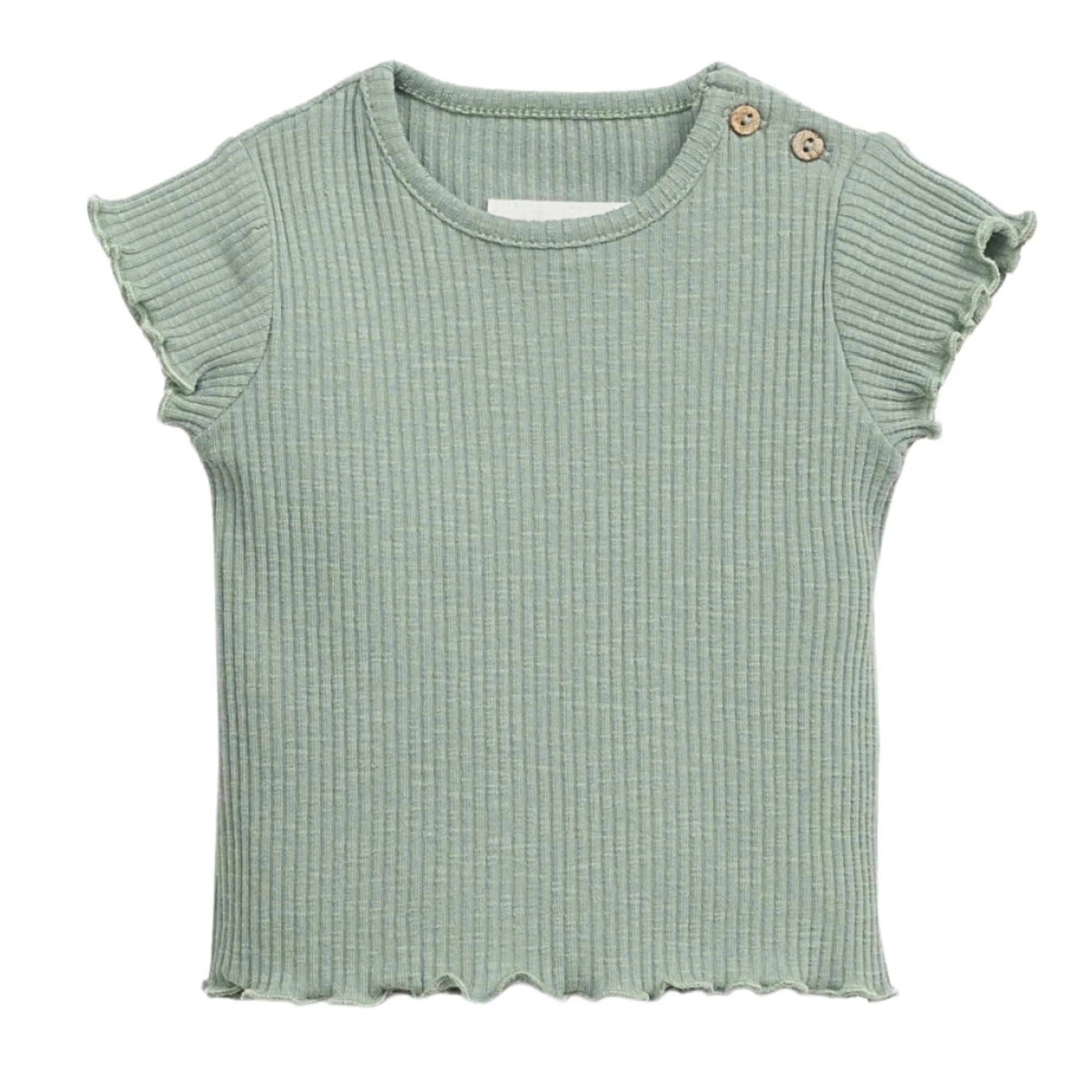Maglia a costine di cotone biologico ed elastan, scollo rotondo, maniche corte e apertura sulla spalla con bottoni in cocco.