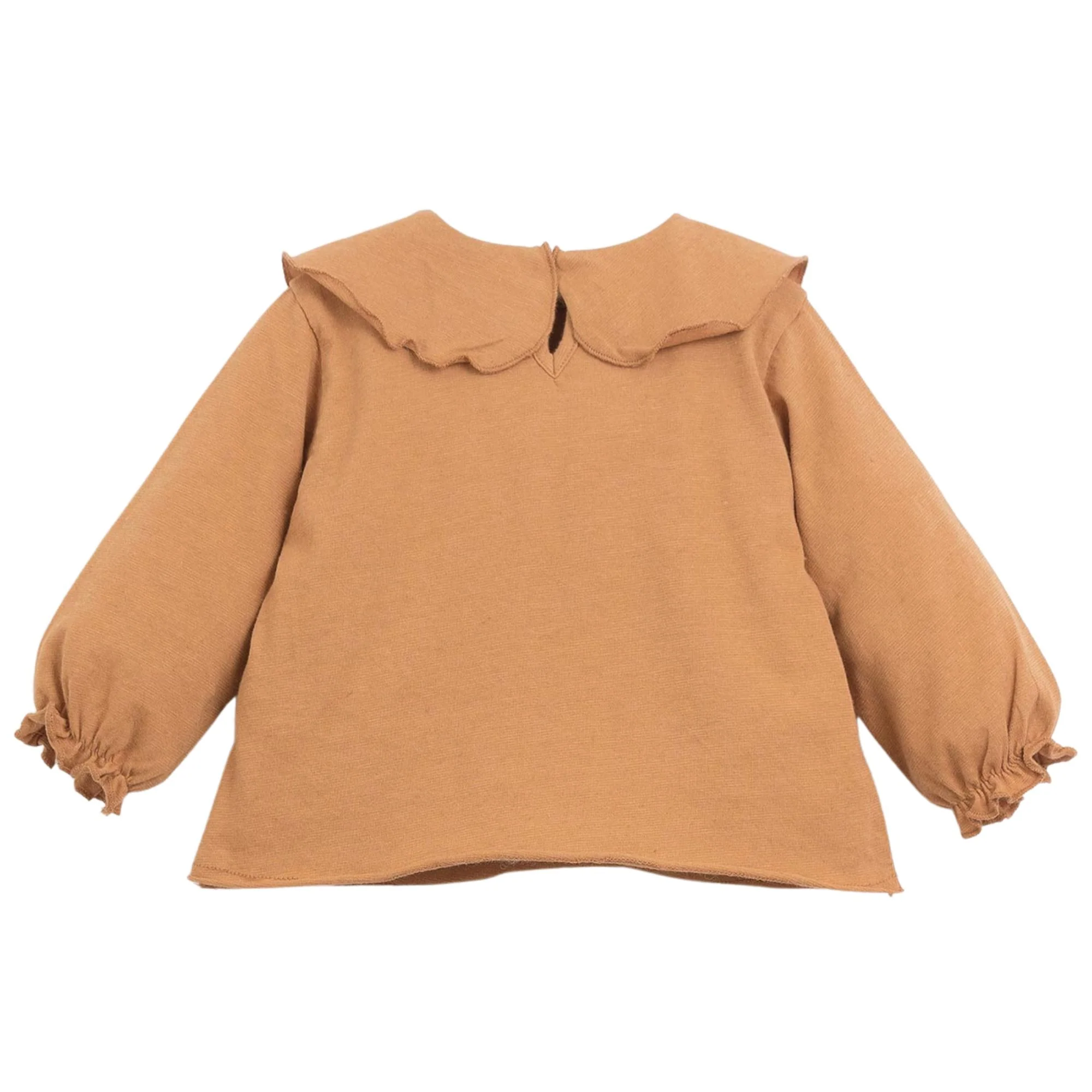T-shirt manica lunga con elastico e collo rotondo con volant, apertura dietro con bottone in cocco.