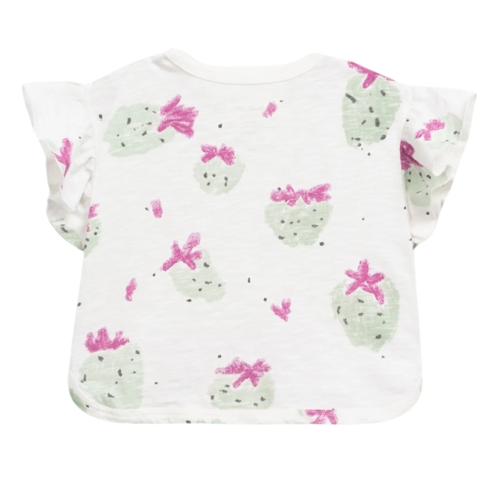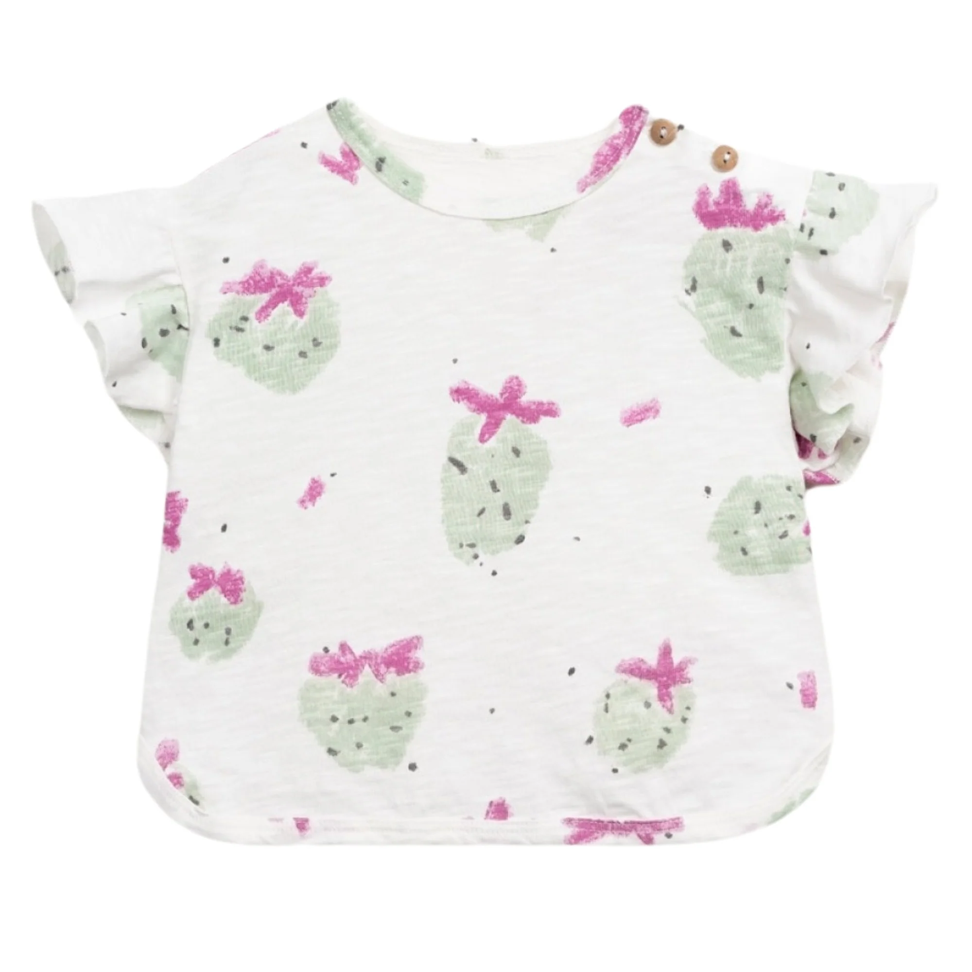 Maglia realizzata in maglia di cotone biologico, stampa fragole, scollo rotondo e maniche corte con volant, apertura sulla spalla con bottoni in legno.