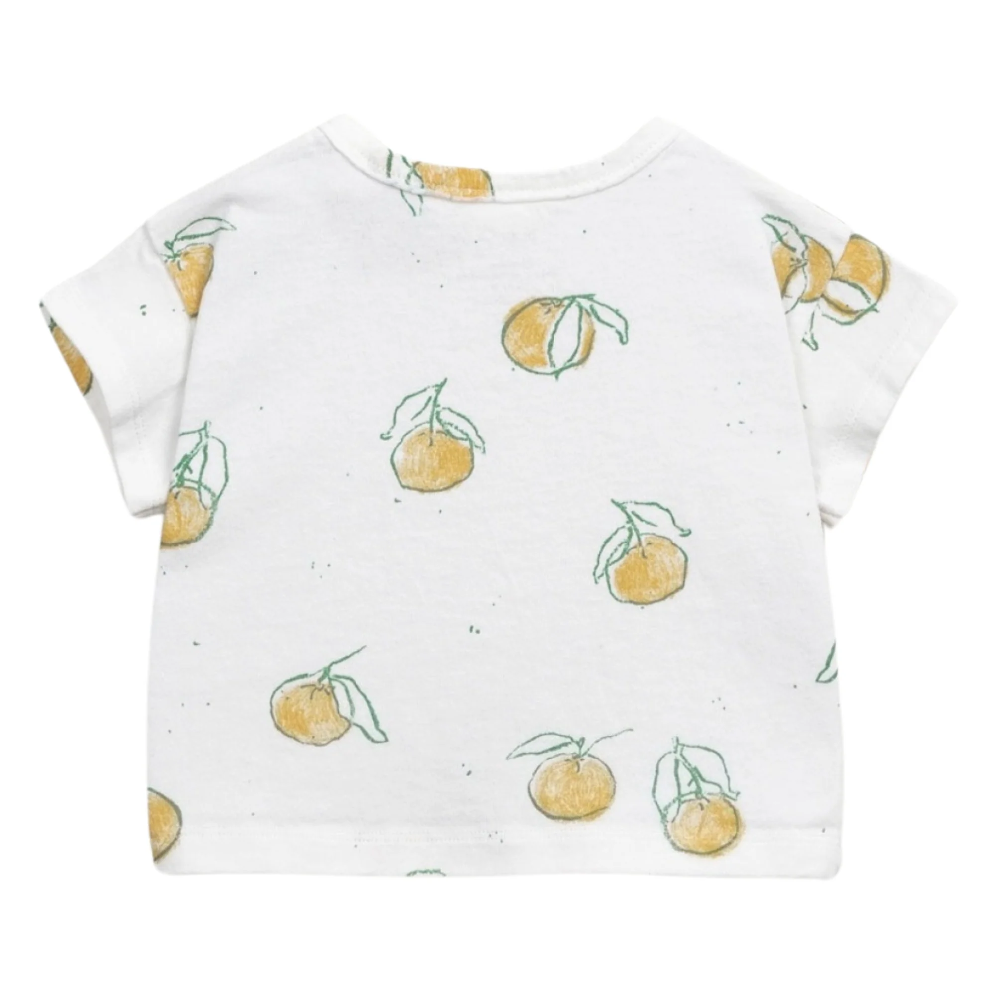 T-shirt รจ realizzata in maglia con una miscela di cotone biologico e cotone riciclato, stampa arance. Scollo rotondo, maniche corte, apertura frontale con bottoni in cocco.
