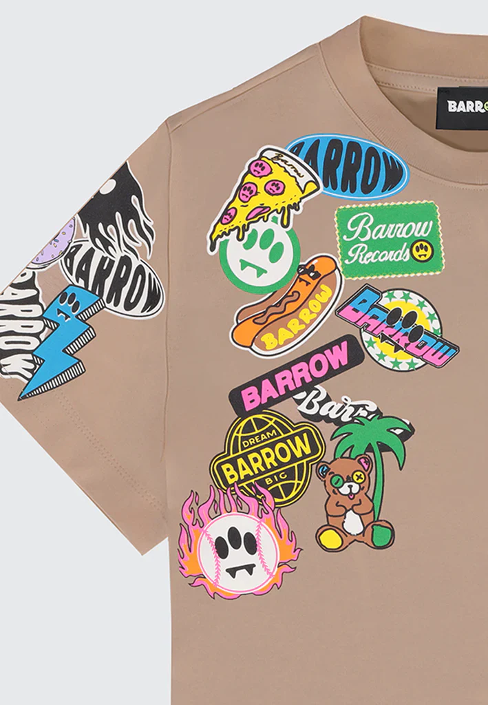 T-shirt unisex in jersey di cotone con vestibilitร regular, caratterizzata da una grafica multicolor stampata su unโunica manica, sia sul fronte che sul retro, per un effetto โstickerโ vivace e distintivo tipico dellโestetica Barrow Kids.
