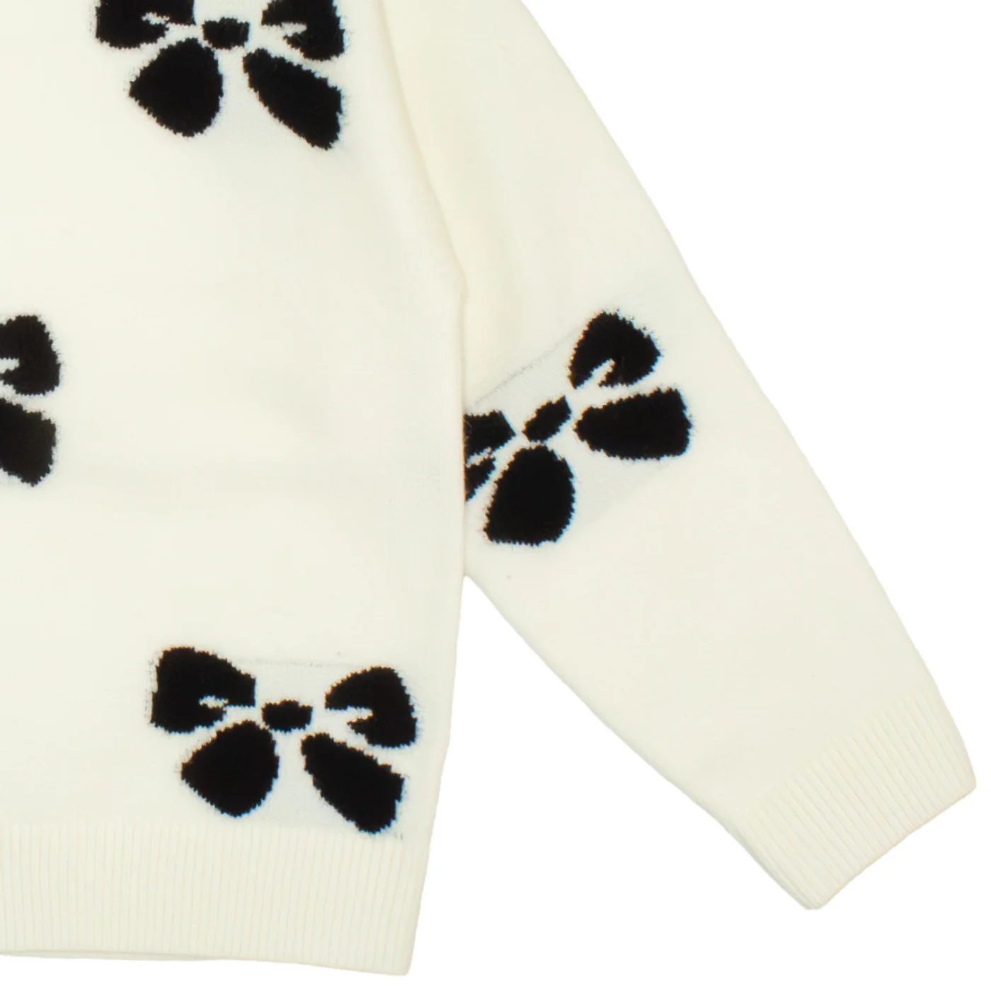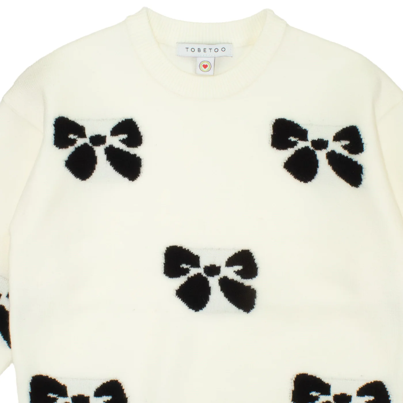 To Be Too maglia girocollo bambina in misto viscosa bianca Fiocchi all overCollo polsini e fondo a costeComposizione: 32% acrlico 30% poliestere 20% viscosa 18% nylonMade in Cina Collezione Autunno Inverno Vestibilitร :Taglia Etร