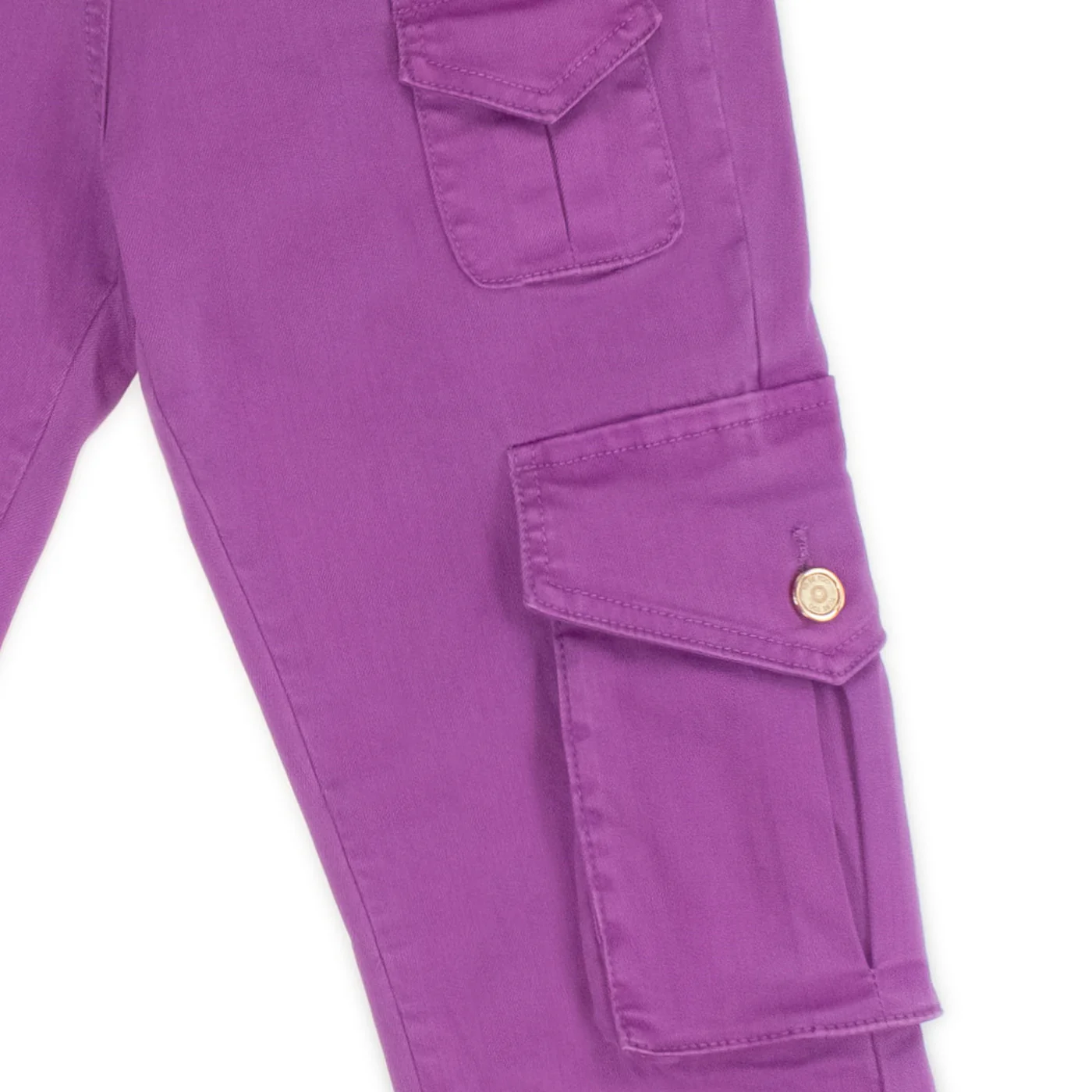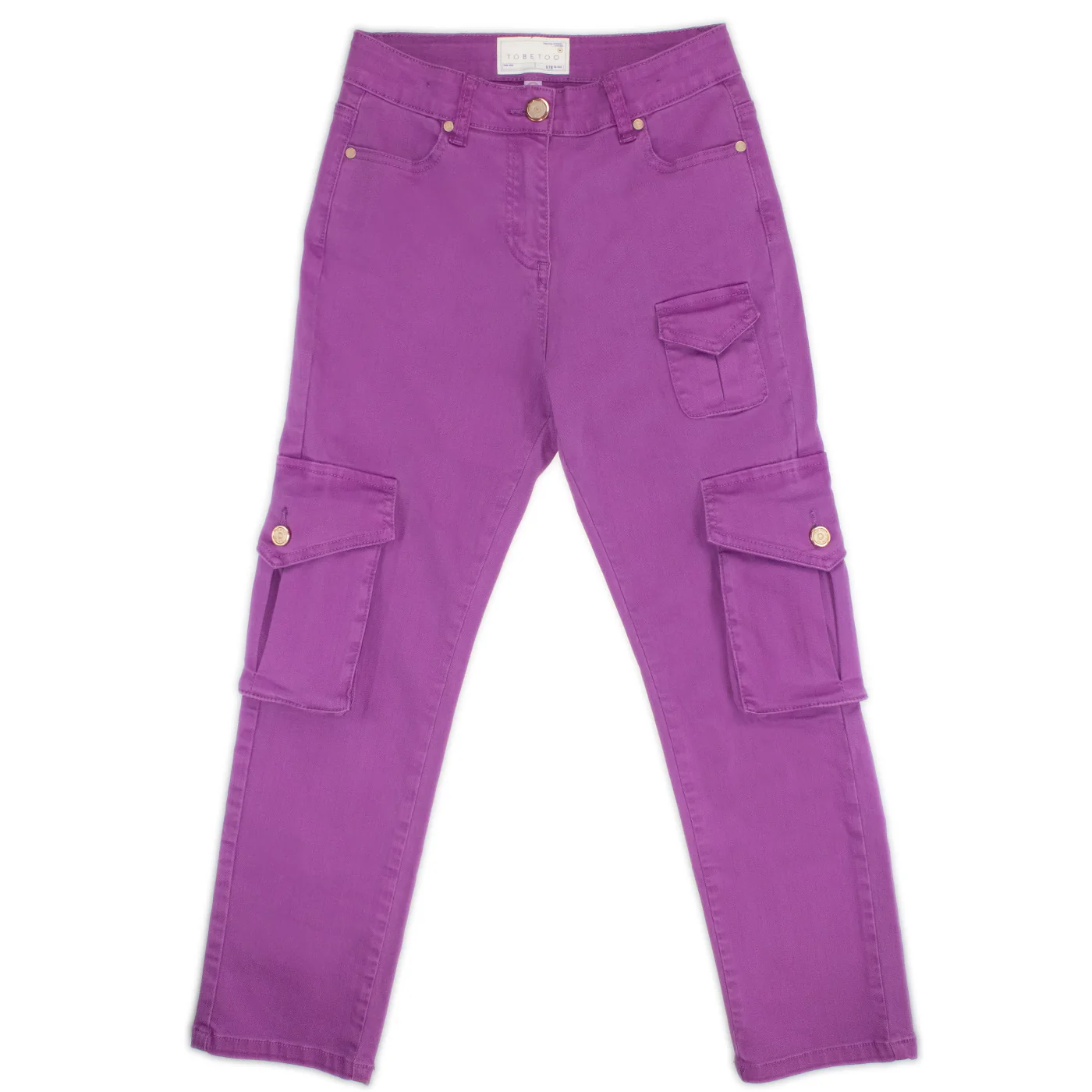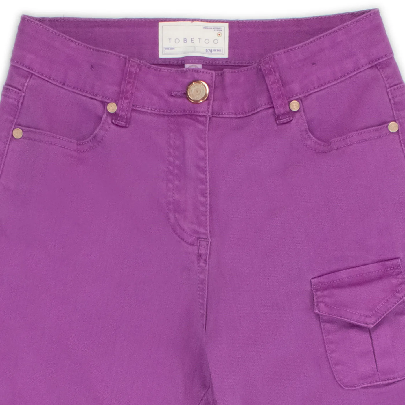 To Be Too pantalone cargo ragazza in cotone viola Vita alta con passanti Cinque tasche Chiusura con zip e bottone Tasconi laterali con patta e bottoniComposizione: 98% cotone 2% elastanMade in CinaCollezione Primavera Estate Vestibilitร :Taglia Etร