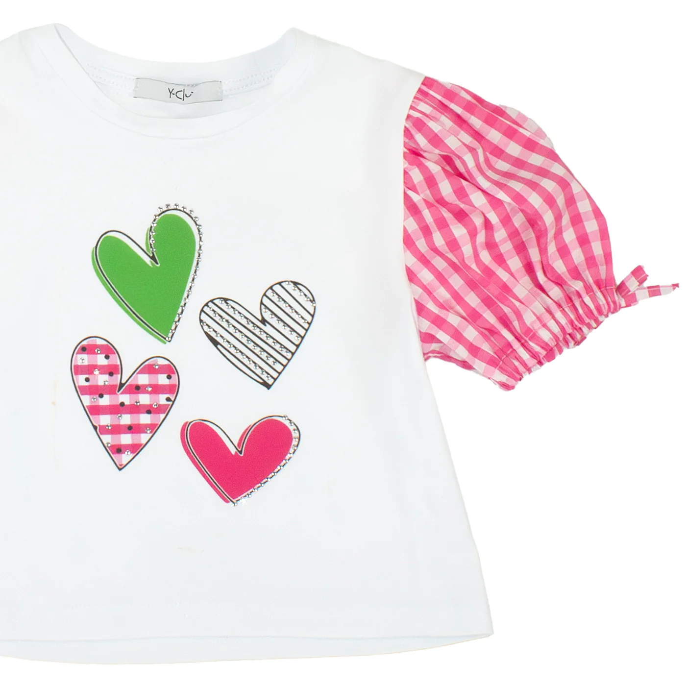 To be too t-shirt girocollo bambina in cotone bianca fuxia Maniche corte a palloncino quadretto e fioccoCuori frontali con swarovski Composizione: 94% cotone 6% elastanMade in CinaCollezione Primavera Estate Vestibilitร :Taglia Etร