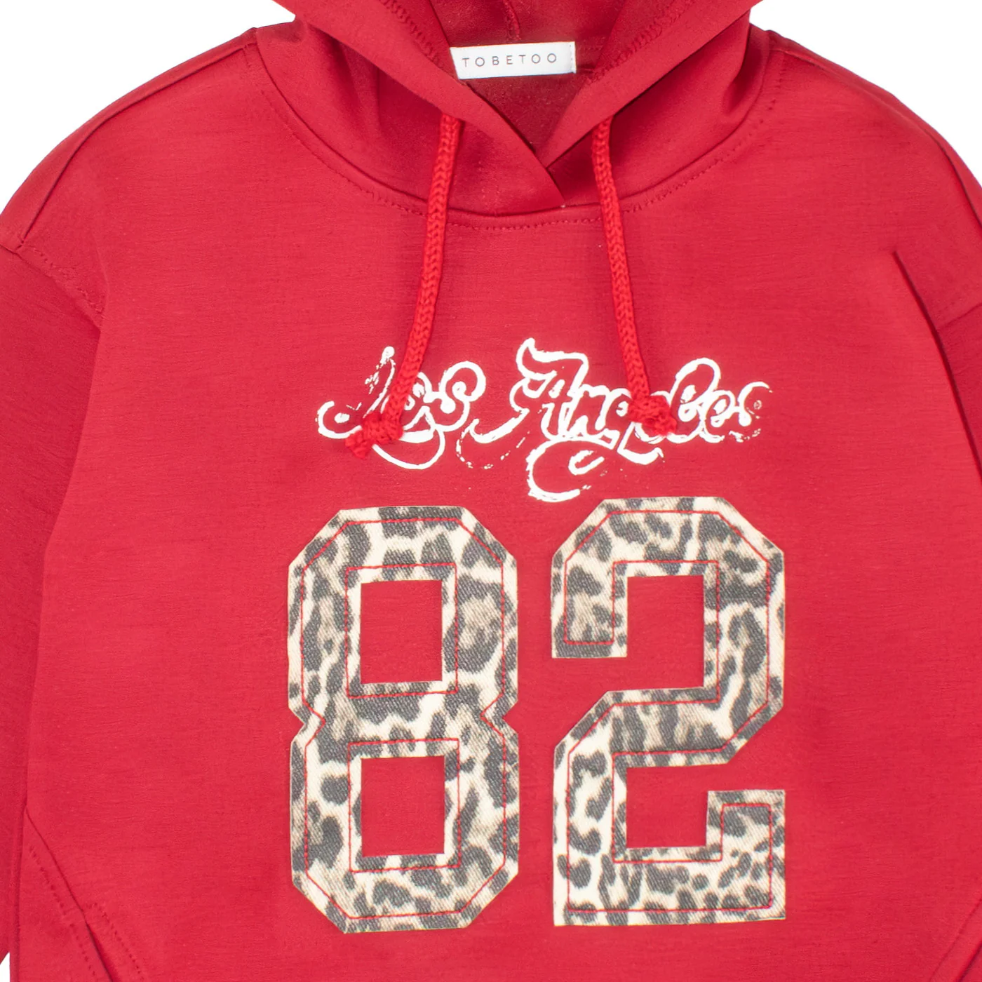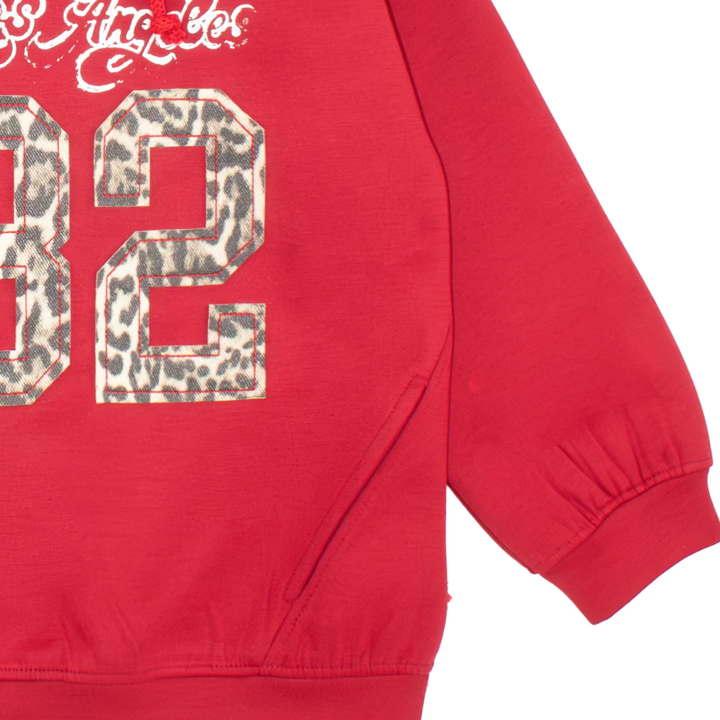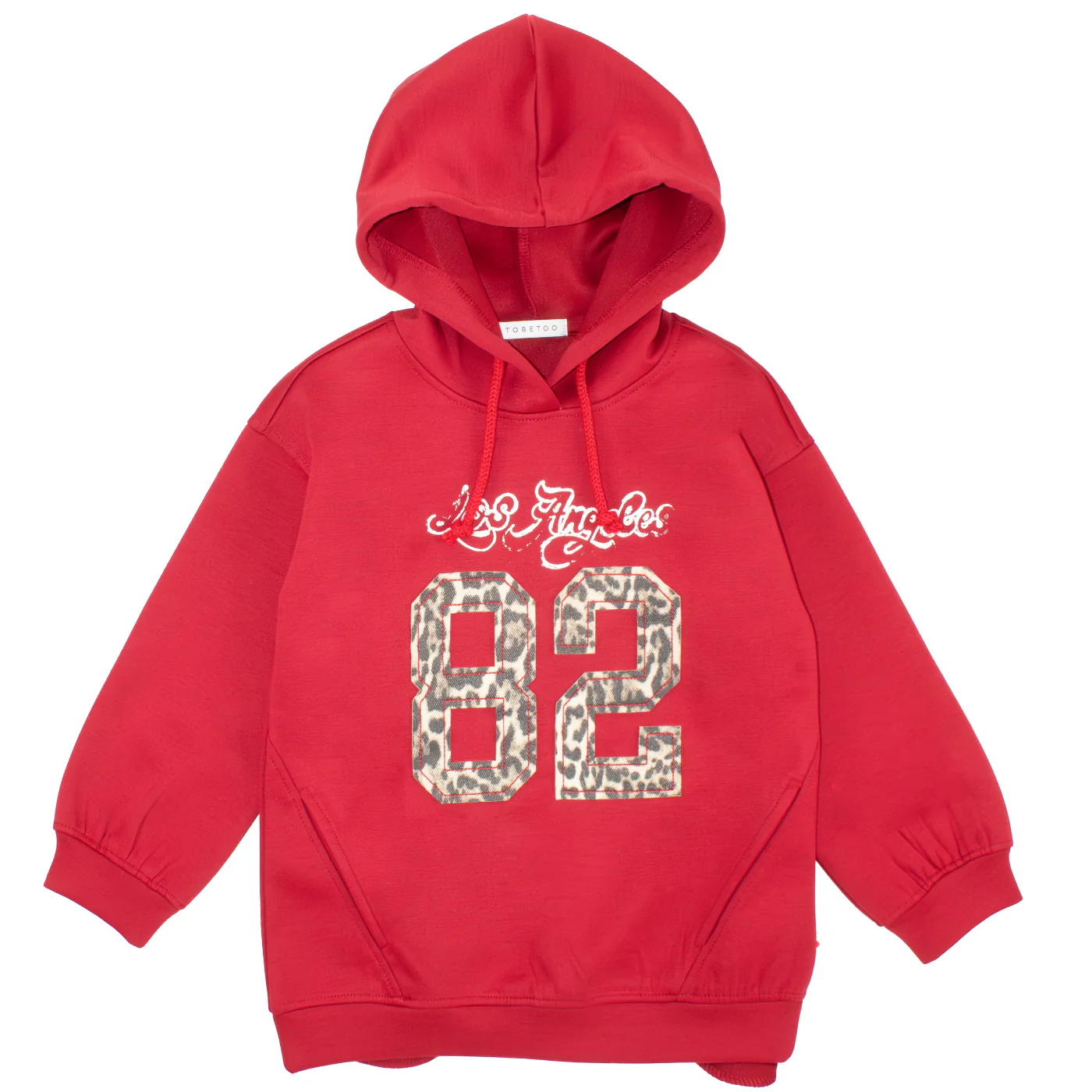 To Be Too vestito con cappuccio bambina in cotone garzato rosso Stampa frontale con patch animalier t Tasche frontali Polsini e fondo a coste Composizione: 85% cotone 15% poliestere Made in Cina Collezione Autunno Inverno Vestibilitร :Taglia Etร
