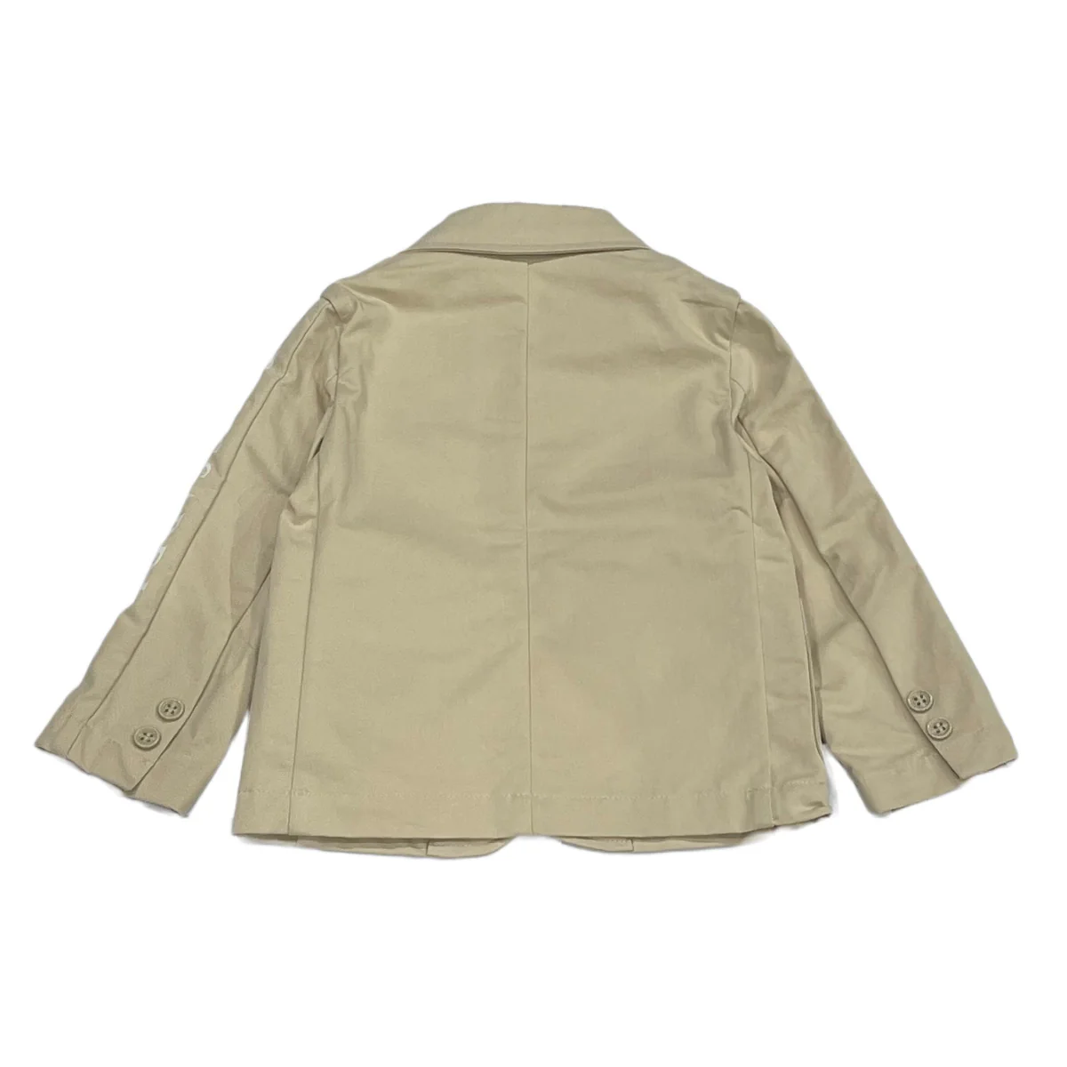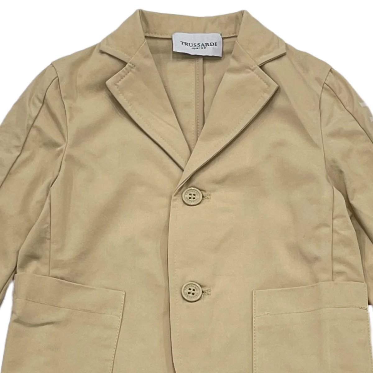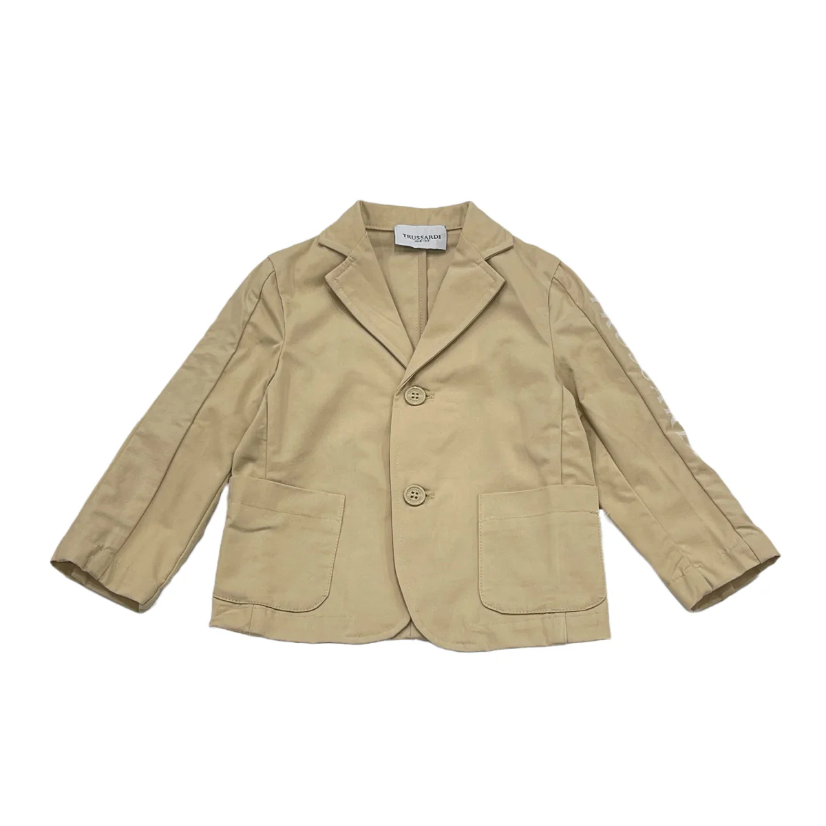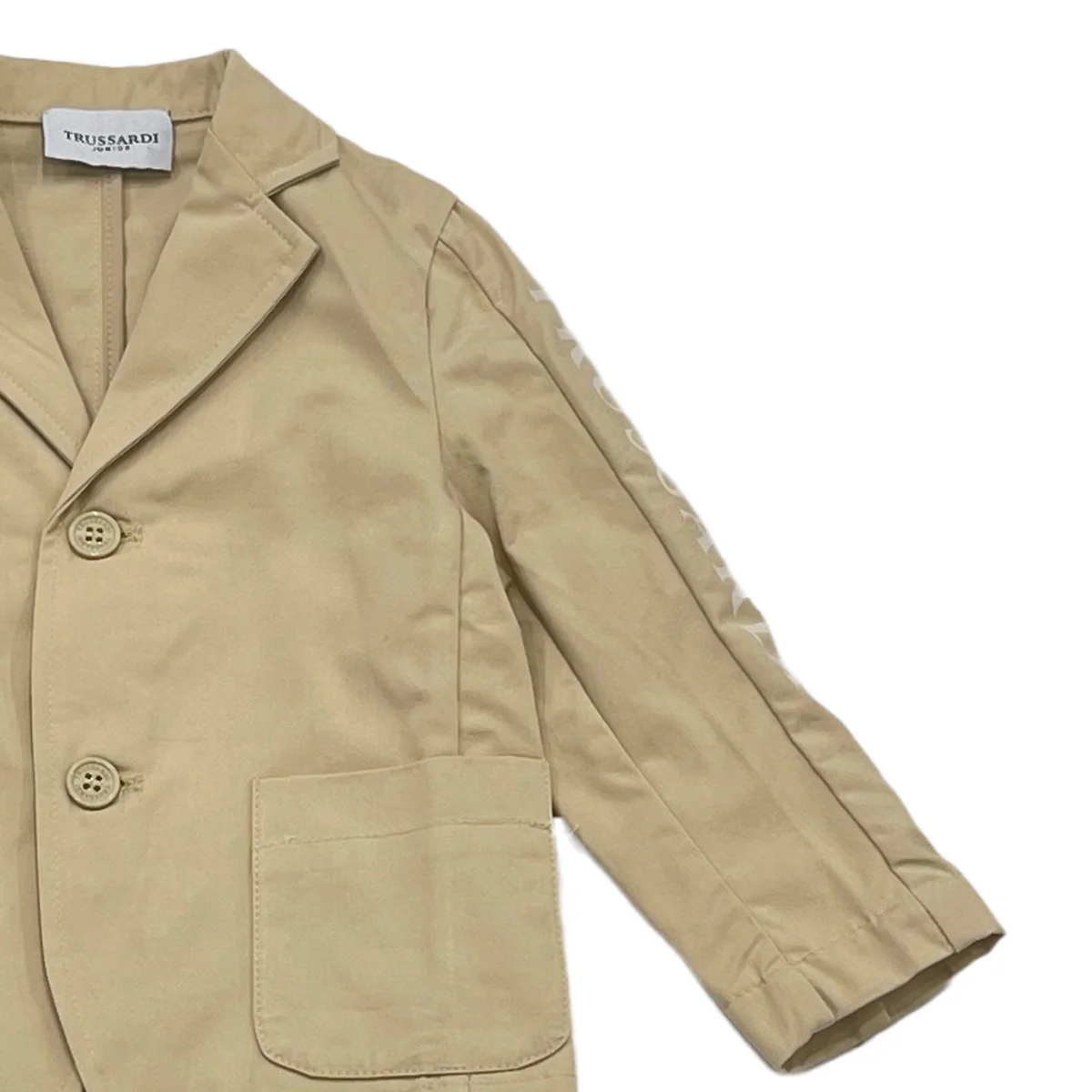 Trussardi giacca neonato cotone beige Collo reverse Chiusura a due bottoni Tasche a toppa frontali Banda logo laterale su manicaComposizione: 97% cotone 3% elastanMade in CinaCollezionec Primavera Estate Vestibilitร :Taglia Etร