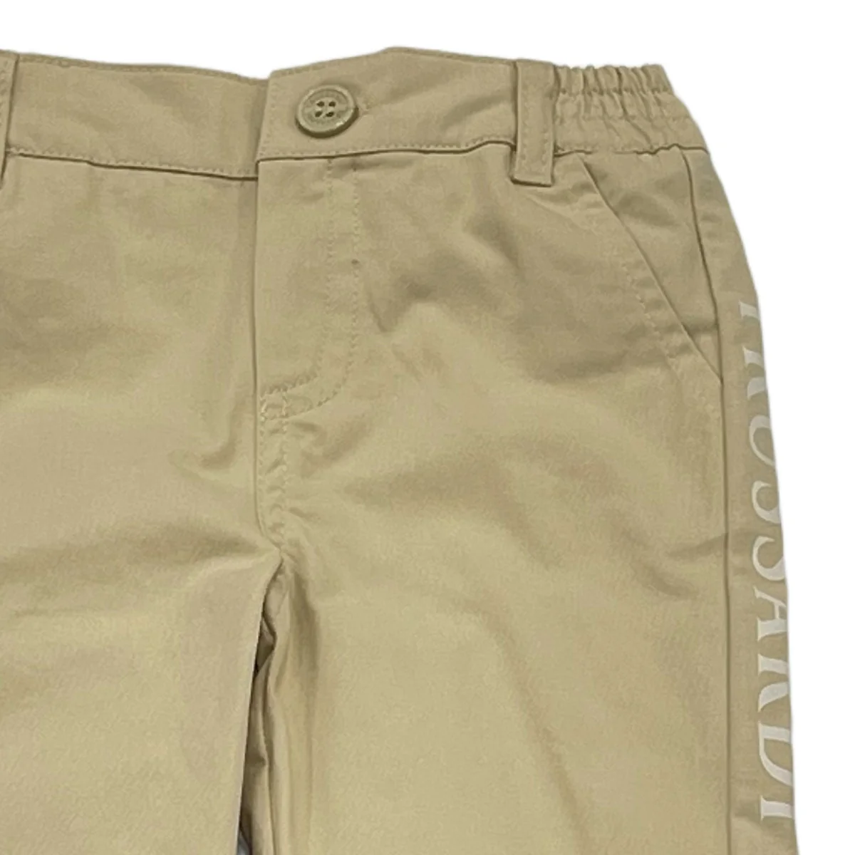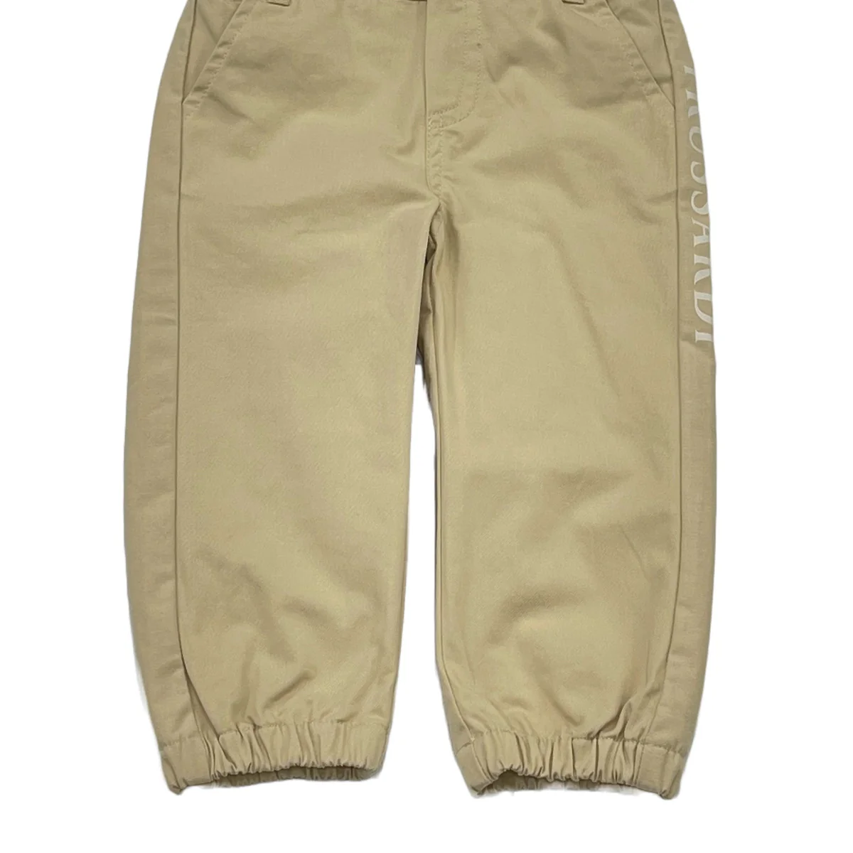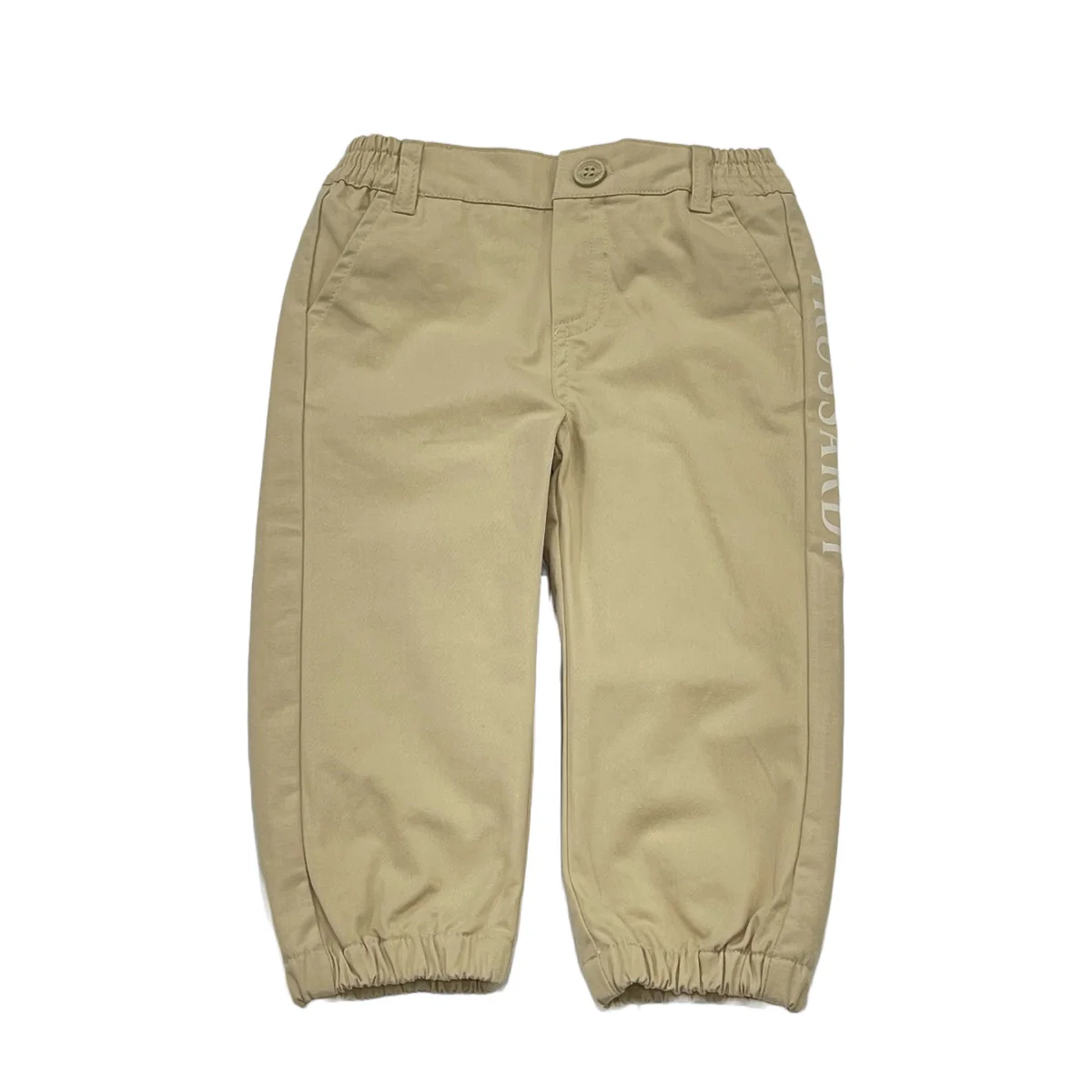 Trussardi pantalone cotone neonato beige Chiusura con zip e bottone logato Vita con passanti Banda logata laterale Tasche America Fondo con elasticiComposizone: 97% cotone 3% elastanMade in CinaCollezione Primavera Estate Vestibilitร :Taglia Etร