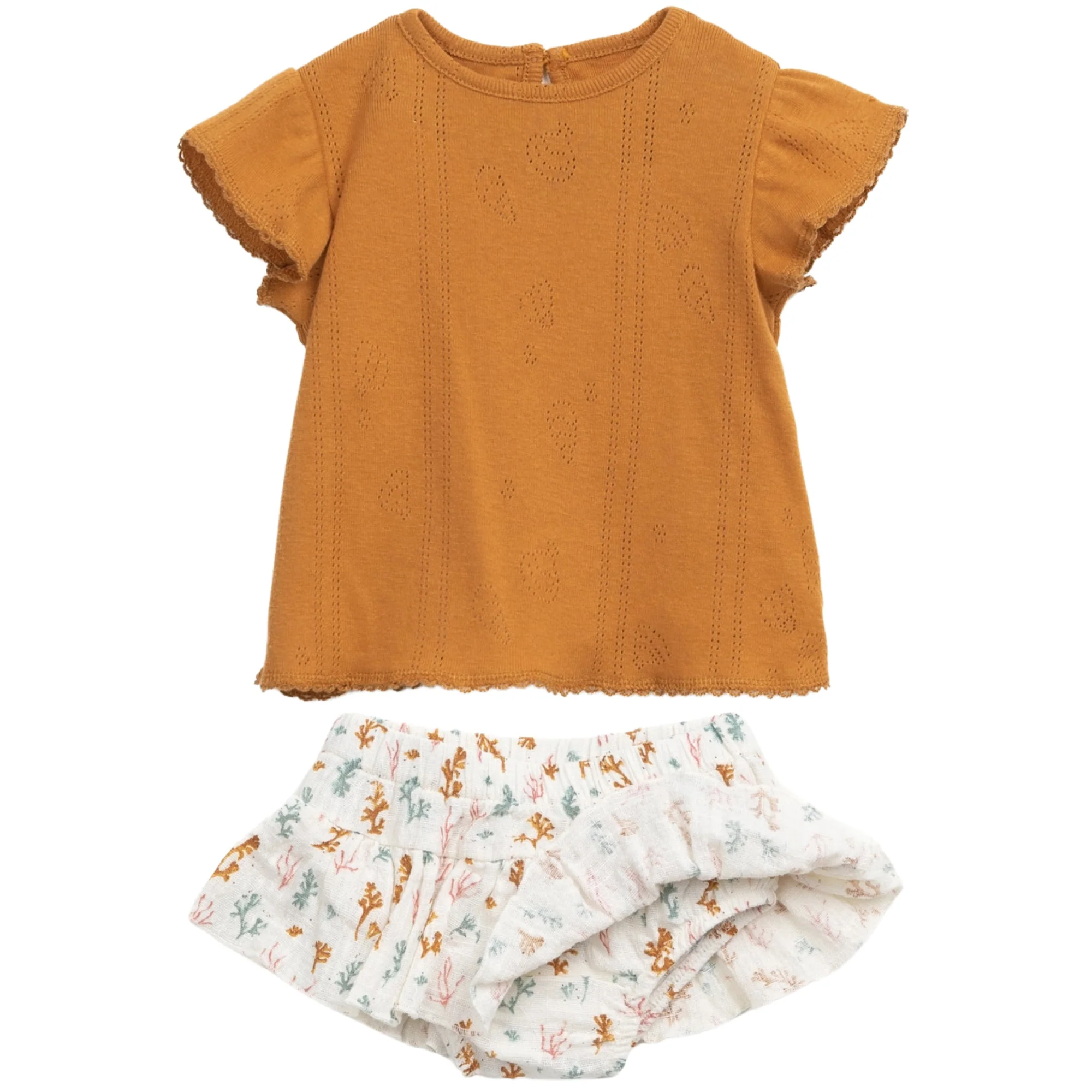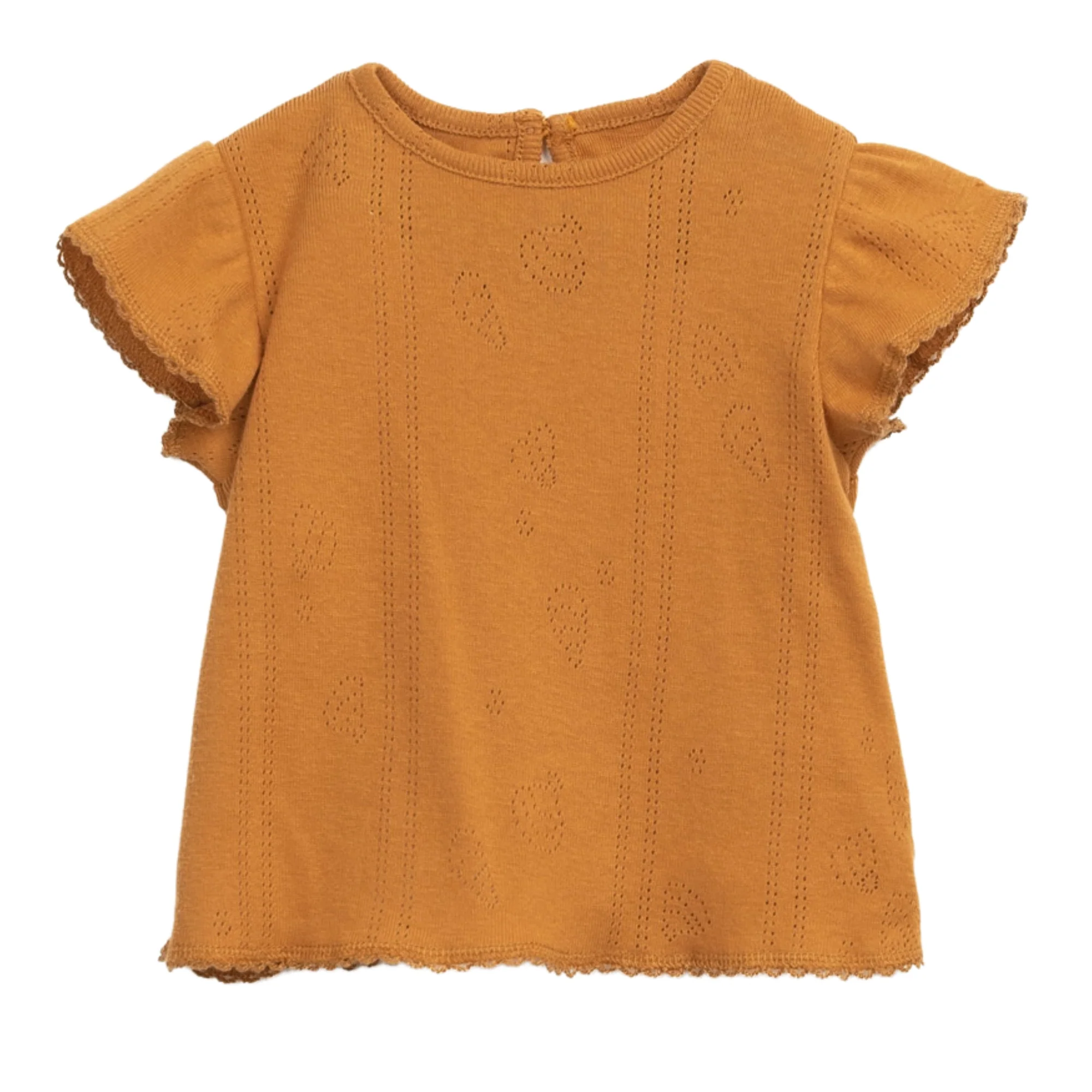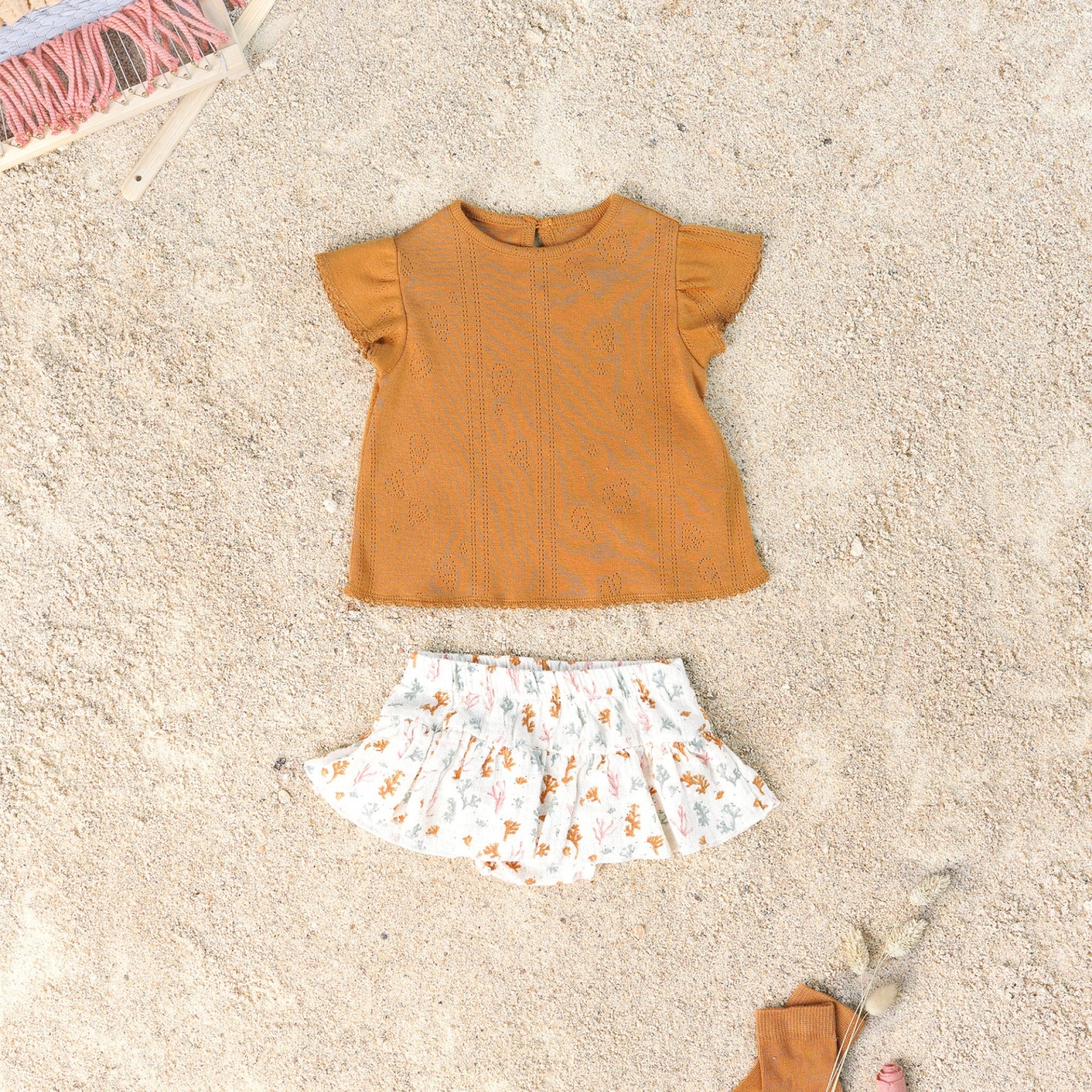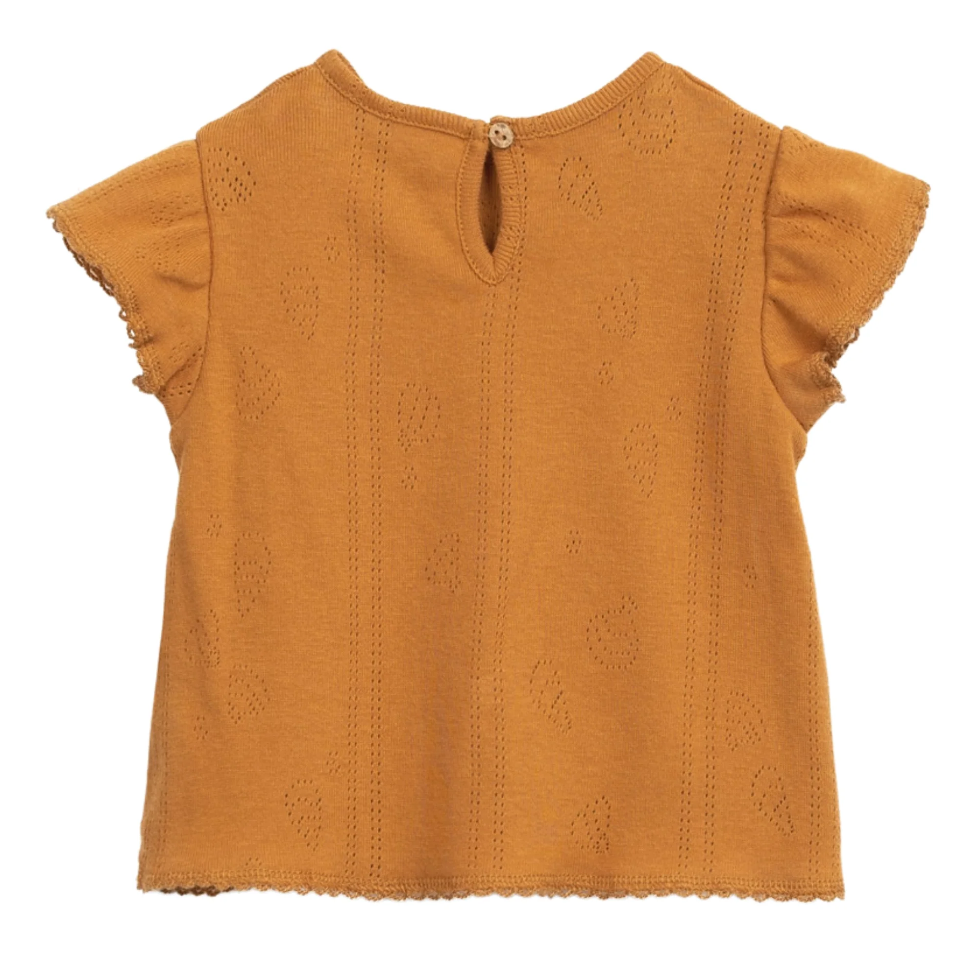 T-shirt realizzata in maglina con cotone biologico, manica corta e collo rotondo, con apertura sulla schiena con bottone in cocco e dettaglio ricamato su maniche e base.