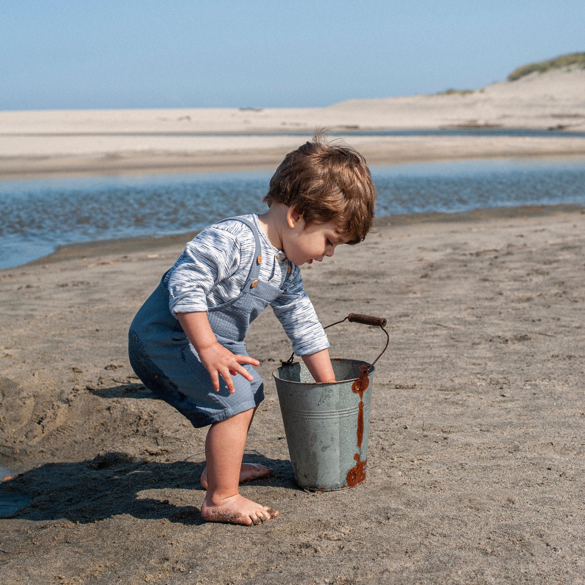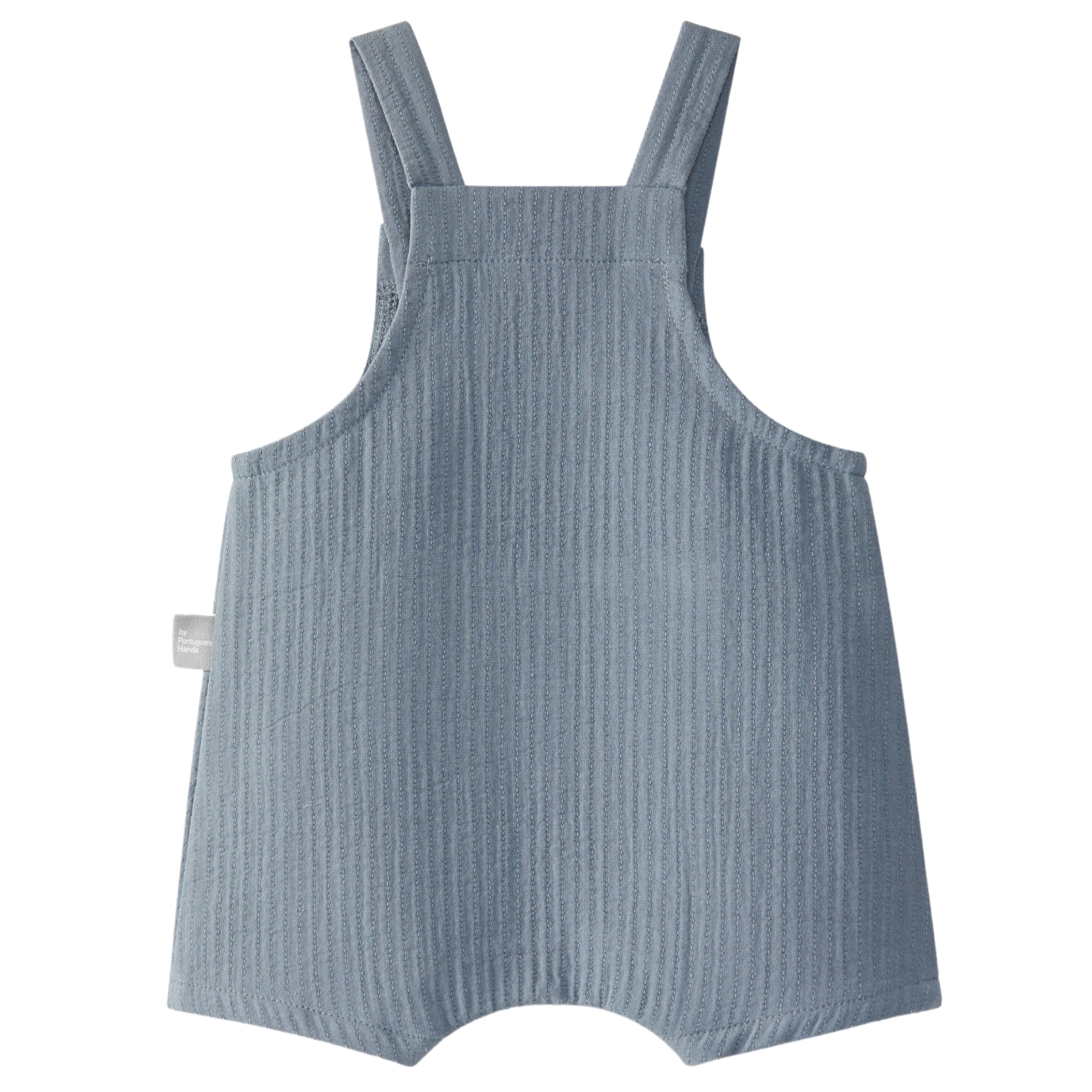 Salopette in jersey rigato, volant sulle spalline. Elastico sul petto e alla schiena per una facile vestizione.