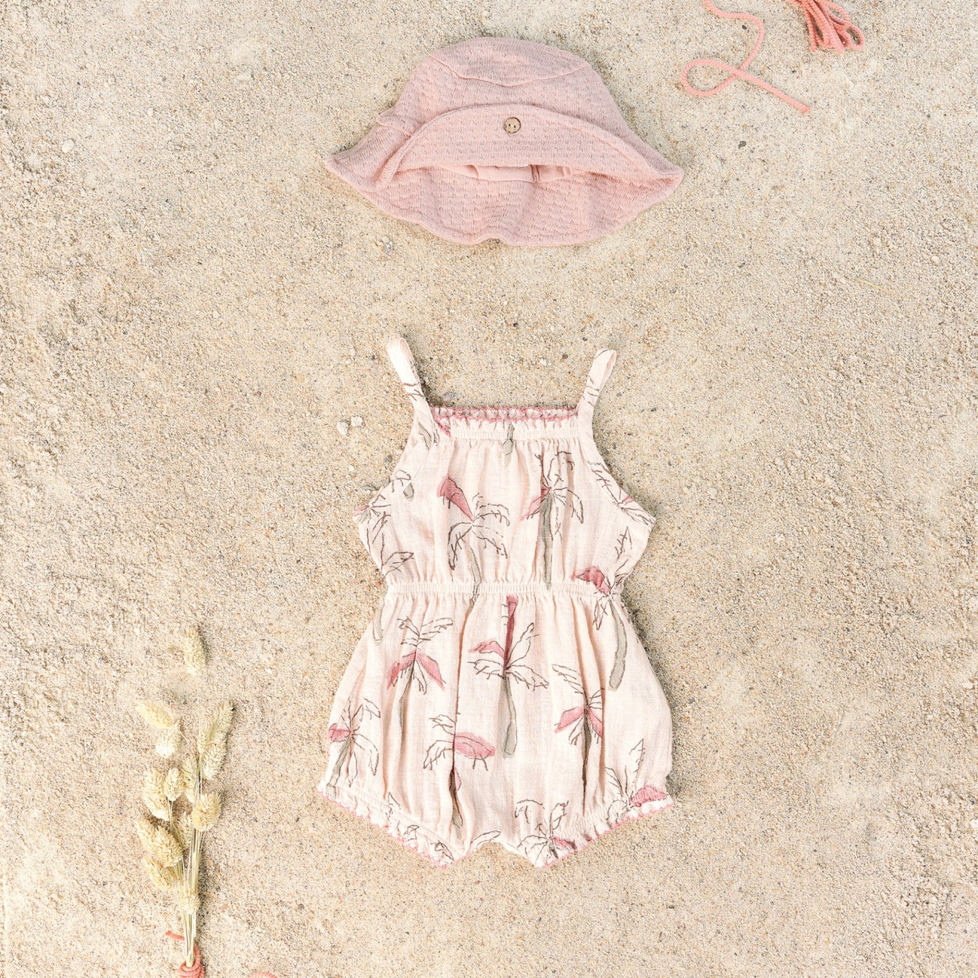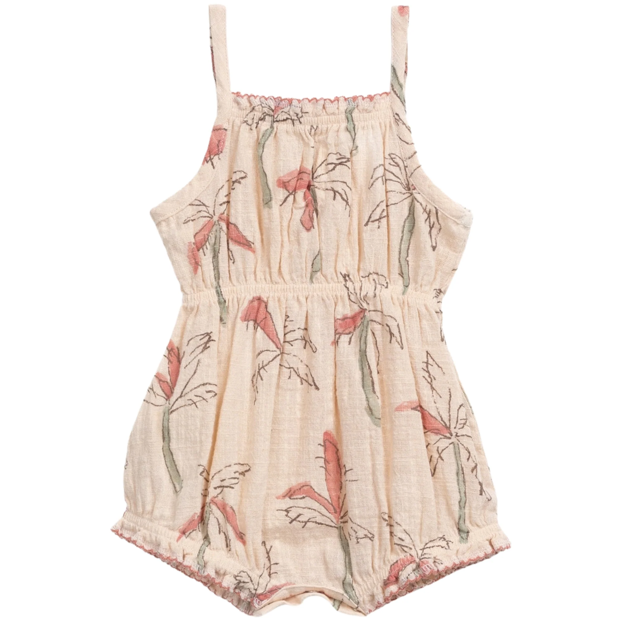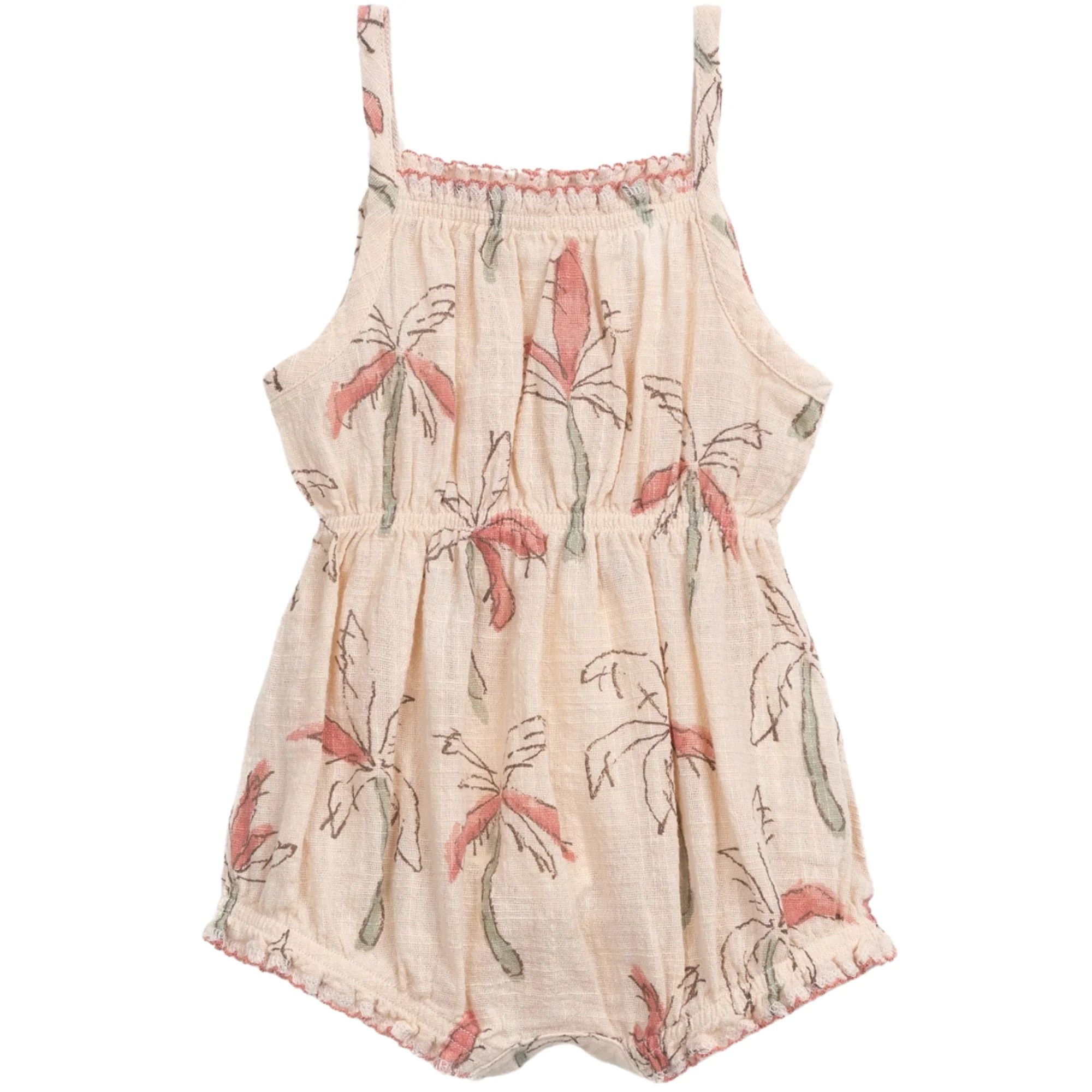 Tutona in cotone stampa palme, modello con spalline ed elastico arricciato sul petto, vita e gambe. Apertura sul cavallo con bottoni a pressione di metallo senza nichel (apertura al cavallo fino alla taglia 18 mesi).