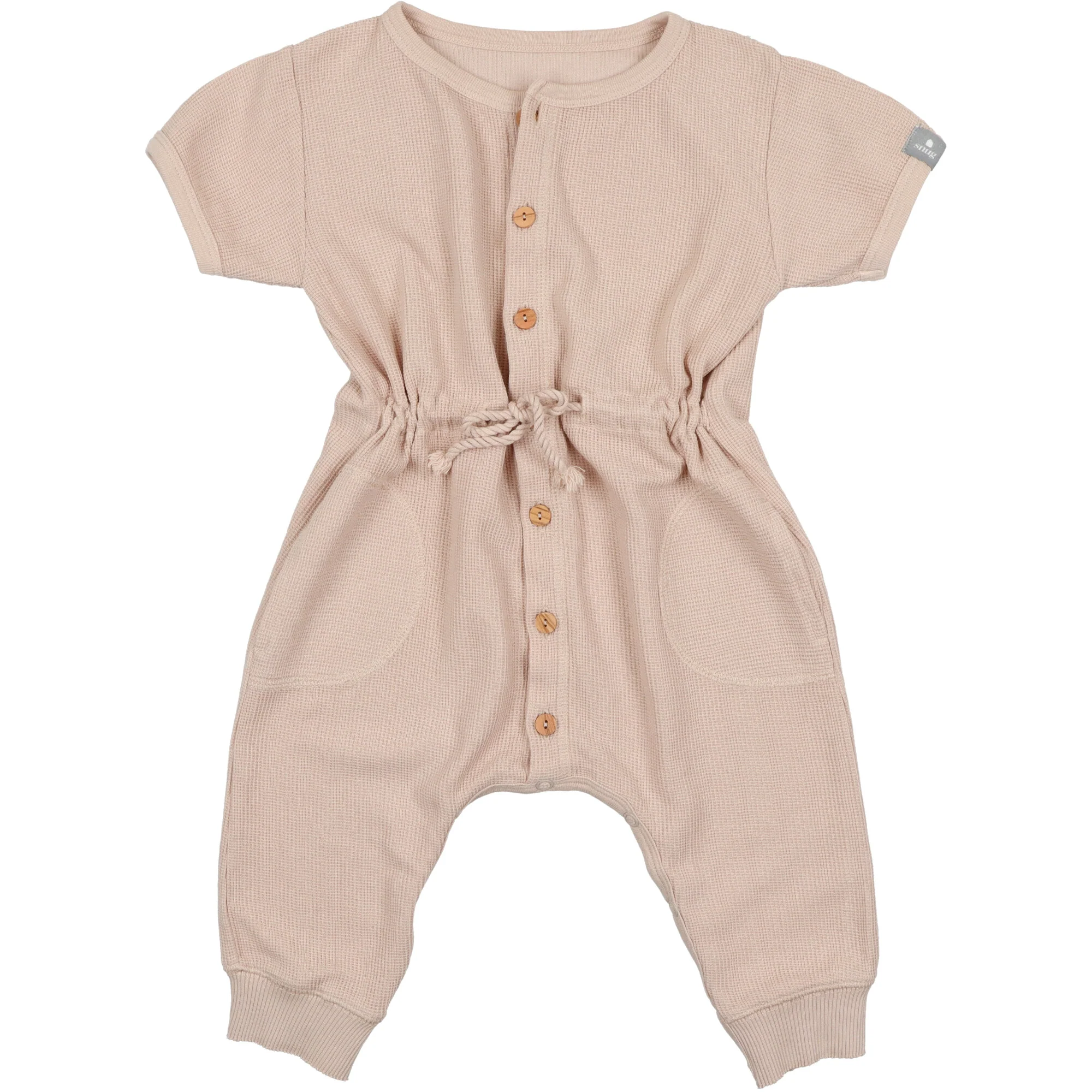 Tuta in jersey di cotone organico 100% testurizzato. Tasche frontali e coulisse funzionale. Si chiude con bottoni in legno a tutta lunghezza e bottoni a pressione tra le gambe.