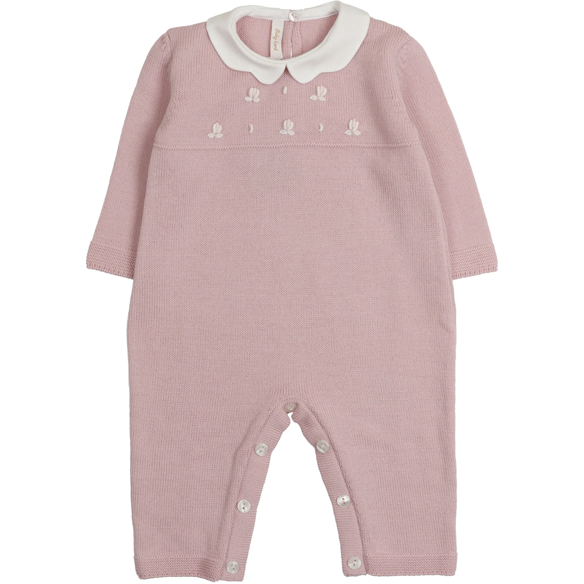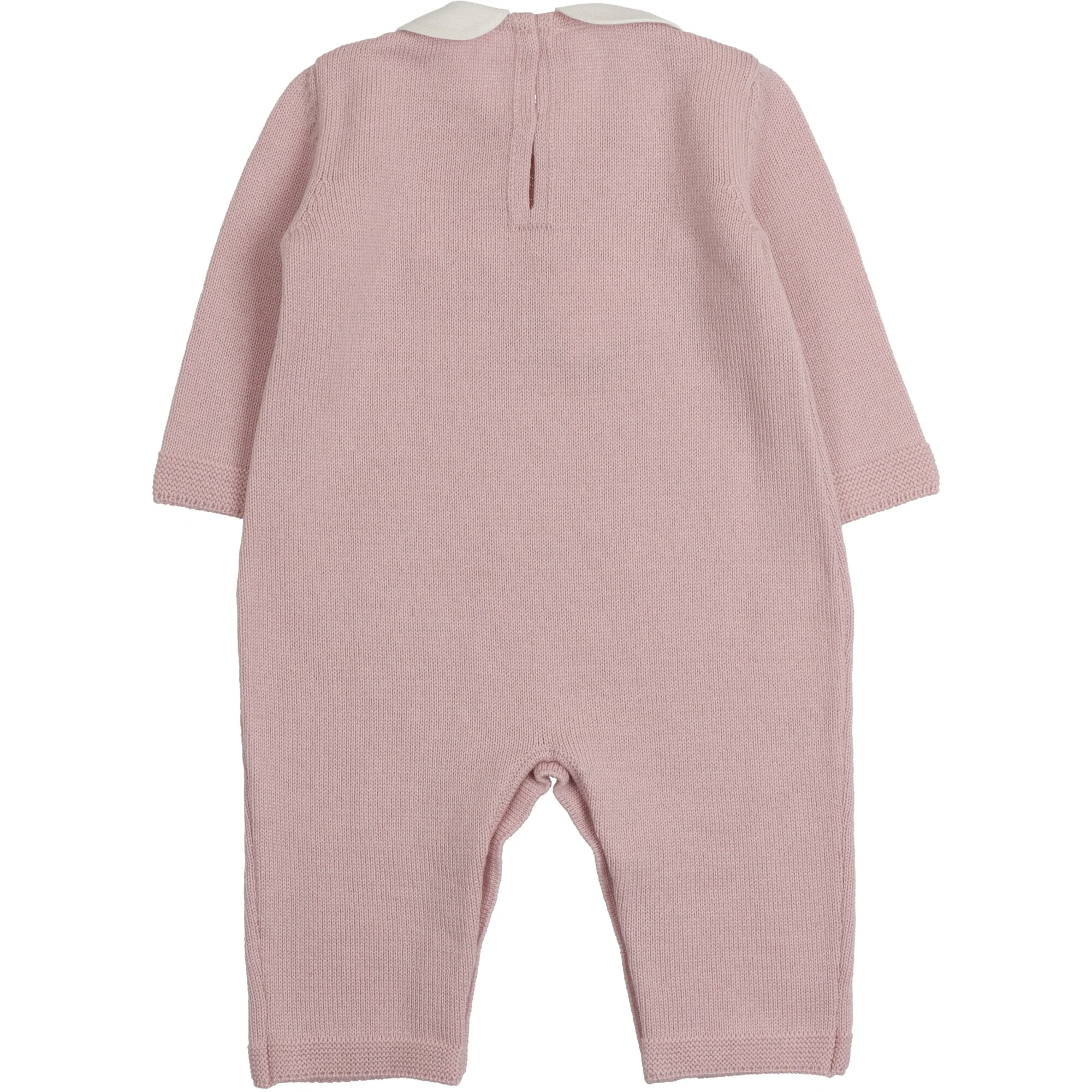 Tutina in lana senza piede con collo rotondo in piquet, ricamata a mano boccioli di rosa sul petto si chiude dietro e sul cavallo con bottoni in madreperla.