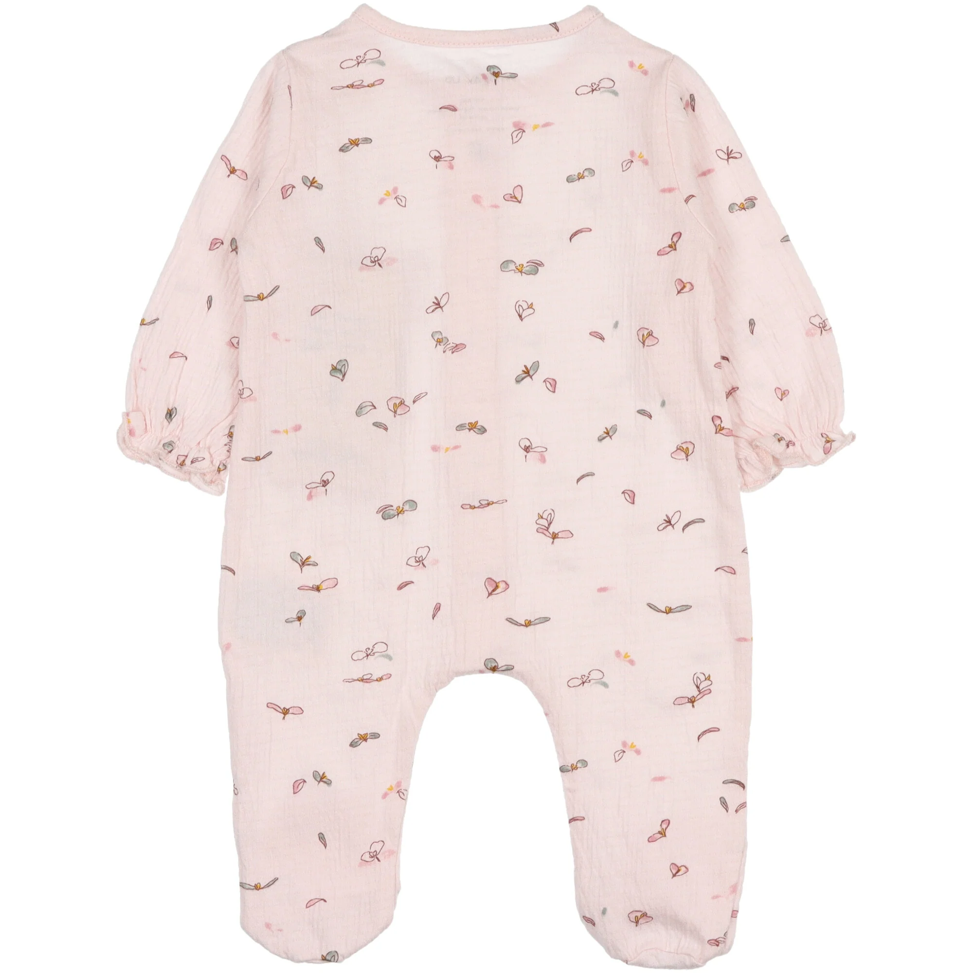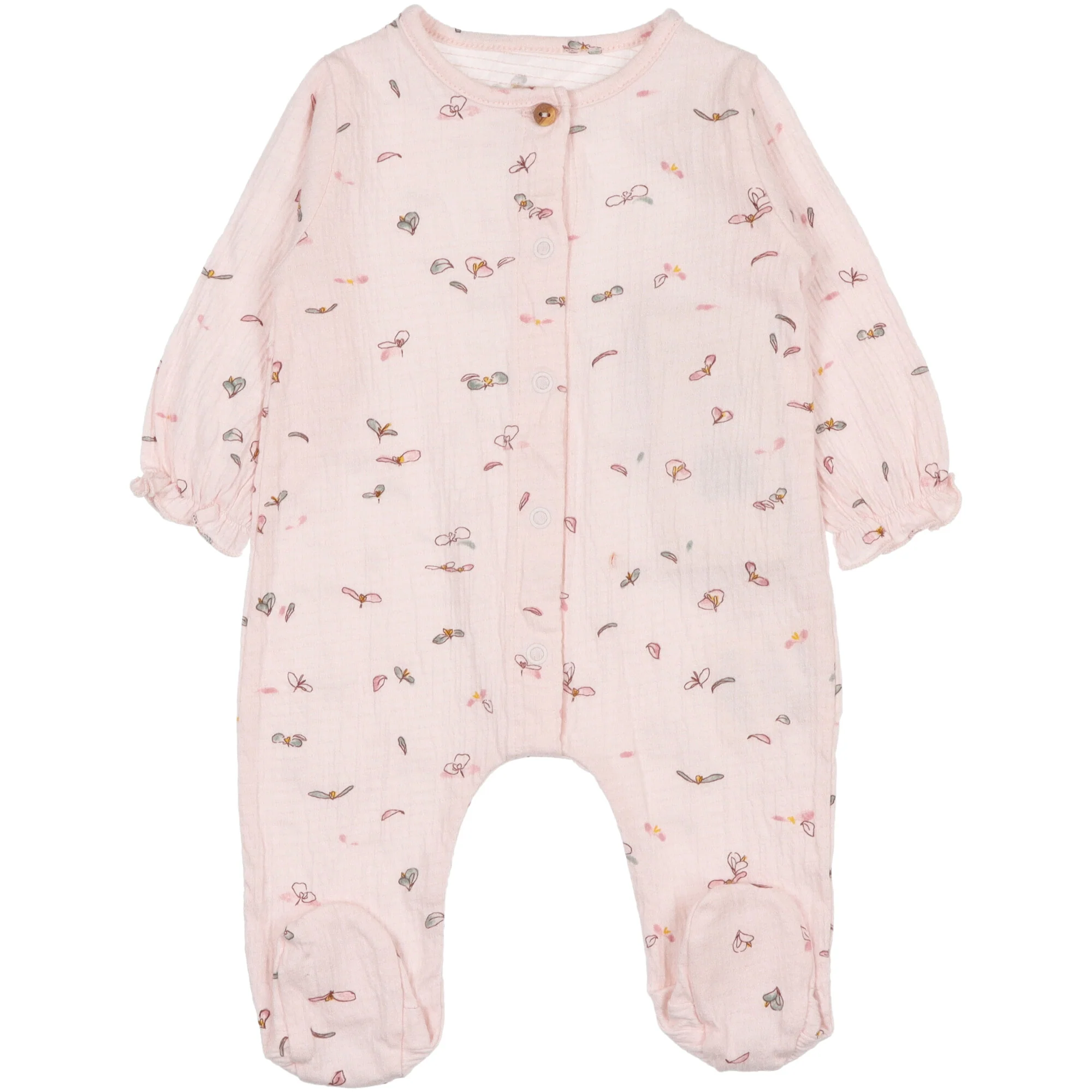 In cotone con stampa a fiorellini, polsini elasticizzati, piedino chiuso, apertura sul davanti con bottoni a pressione di metallo senza nichel. Un bottone in legno con asola. Tutte le materie prime utilizzate in questo capo vantano una certificazione Standard 100 di OEKO-TEX che lo dichiara privo di sostanze nocive per la pelle dei bambini.