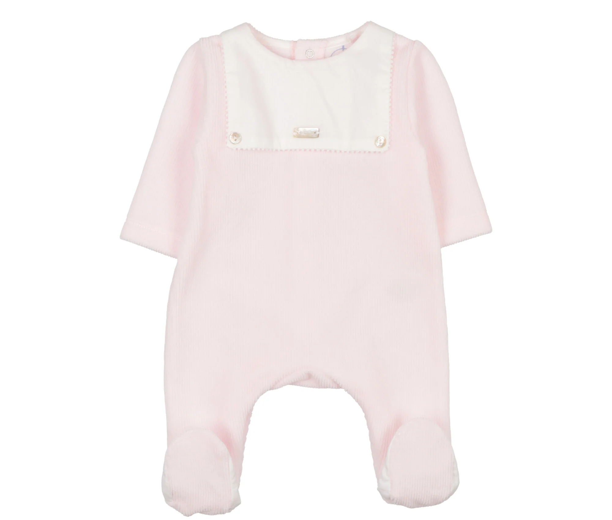 DESCRIZIONEDettaglio: maniche lunghe, senza colletto, graziosa tonalitร  di rosa arrichita pettorina in cotone bianco fermata con bottoncini in madreperla cuciti. Apertura sul retro e sul cavallo con bottoni a pressione.Tessuto: caldo cotone.Composizione: 94% cotone, 5% poliestere, 1% elastane.Cura: lavare in lavatrice a 30ยฐ, lavare separatamente, ferro medio.