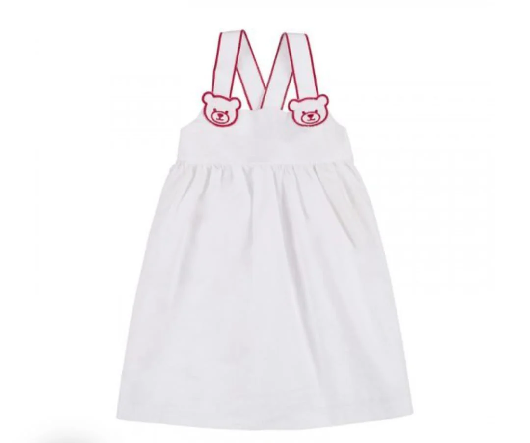 Delizioso abito smanicato bianco con dolci spalline con orsetto rosse, un capo perfetto che accompagnerร la tua bimba nelle sue giornate con infinita dolcezza!
