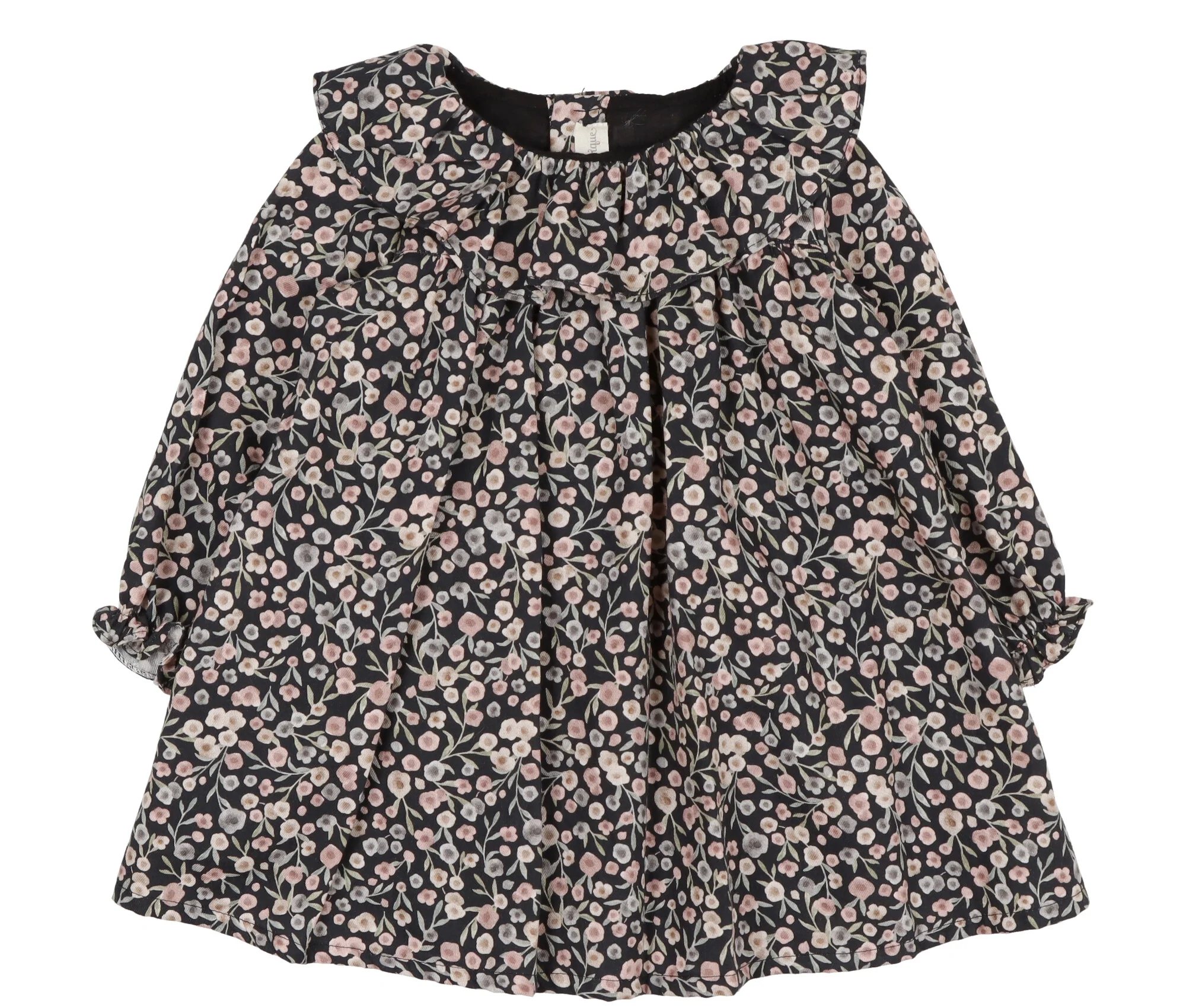 Abito taglio svasato realizzato in cotone fantasia fiori, girocollo con volantes, manica lunga e polsini elasticizzati Foderato in cotone colore nero chiusura dietro con bottoni ed asole. Stampa fiori variante unica.