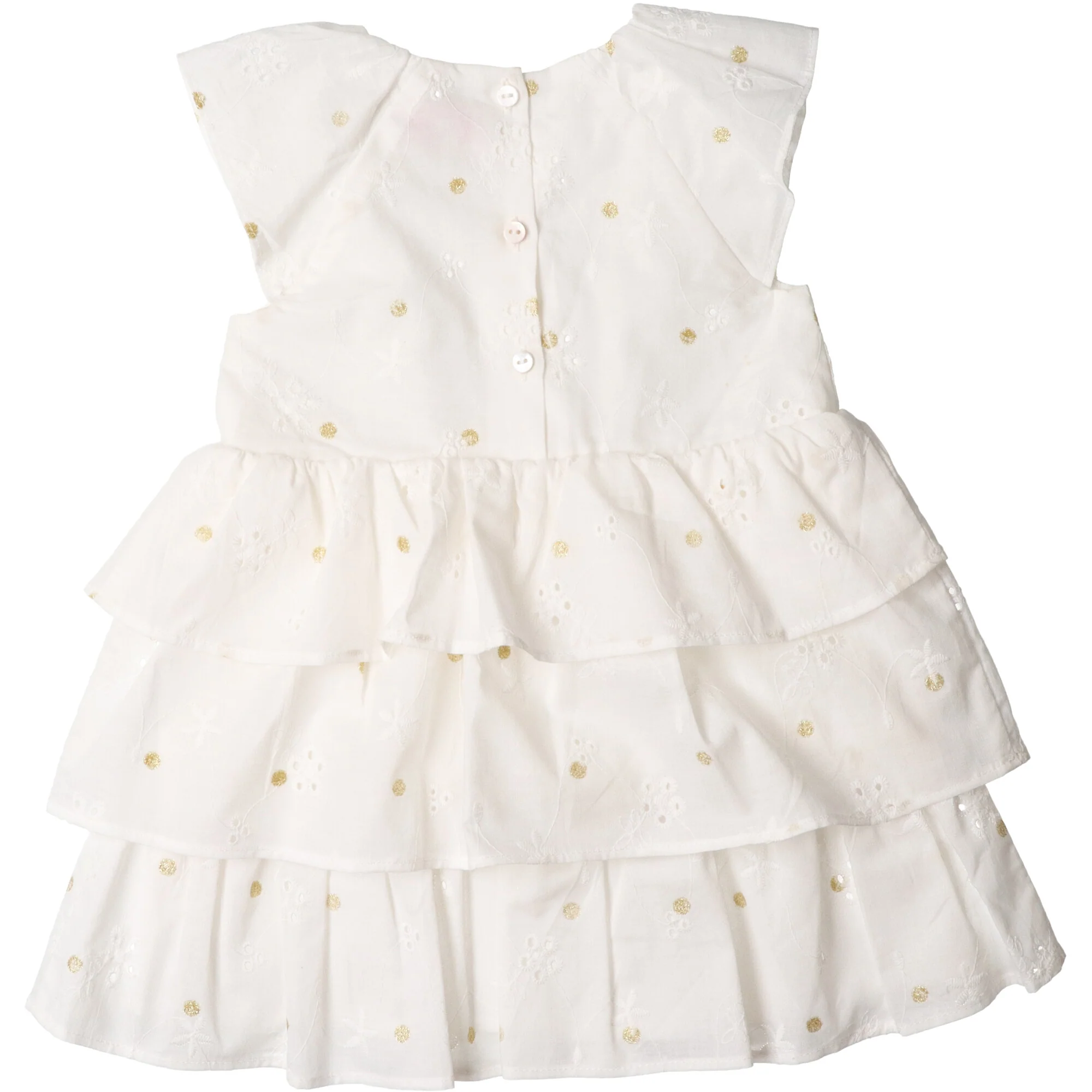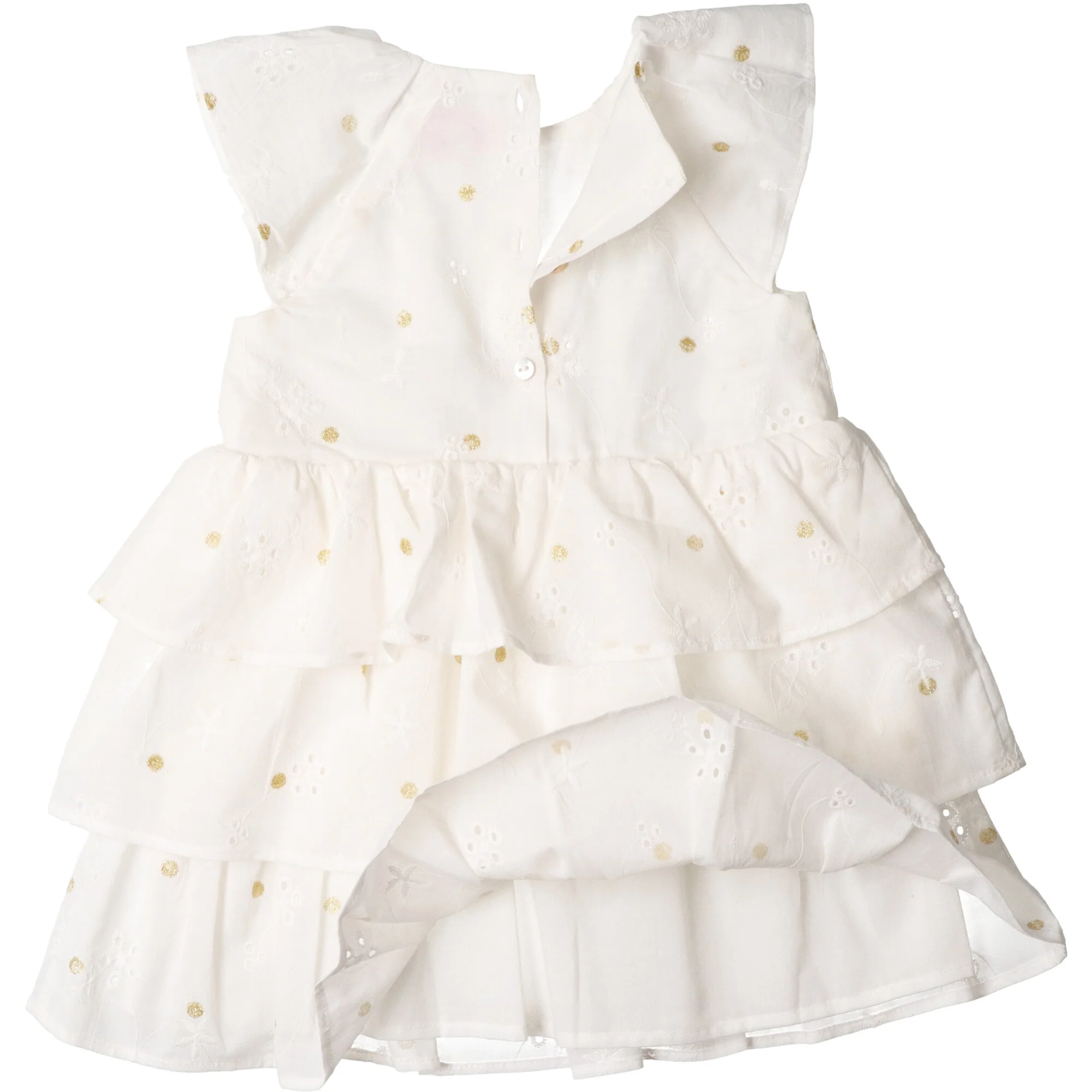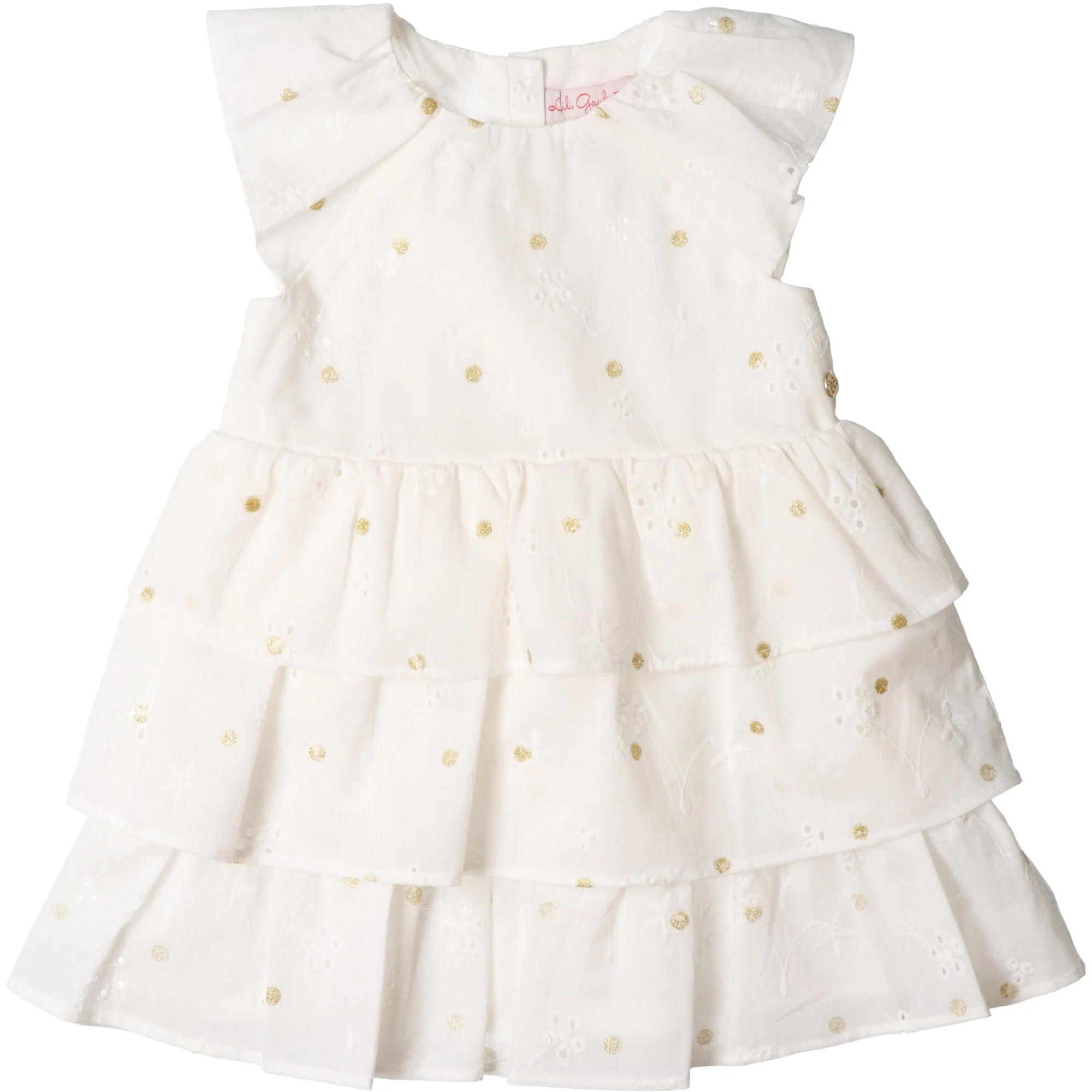 Vestito a balze in sangallo con delicati pois colore oro, chiusura con bottoni sul retro. L’abito รจ completamente foderato. Composizione: 100% cotone.Cura: lavare ad acqua, non lavare a secco, non candeggiare, non asciugare in asciugatrice, si puรฒ stirare.