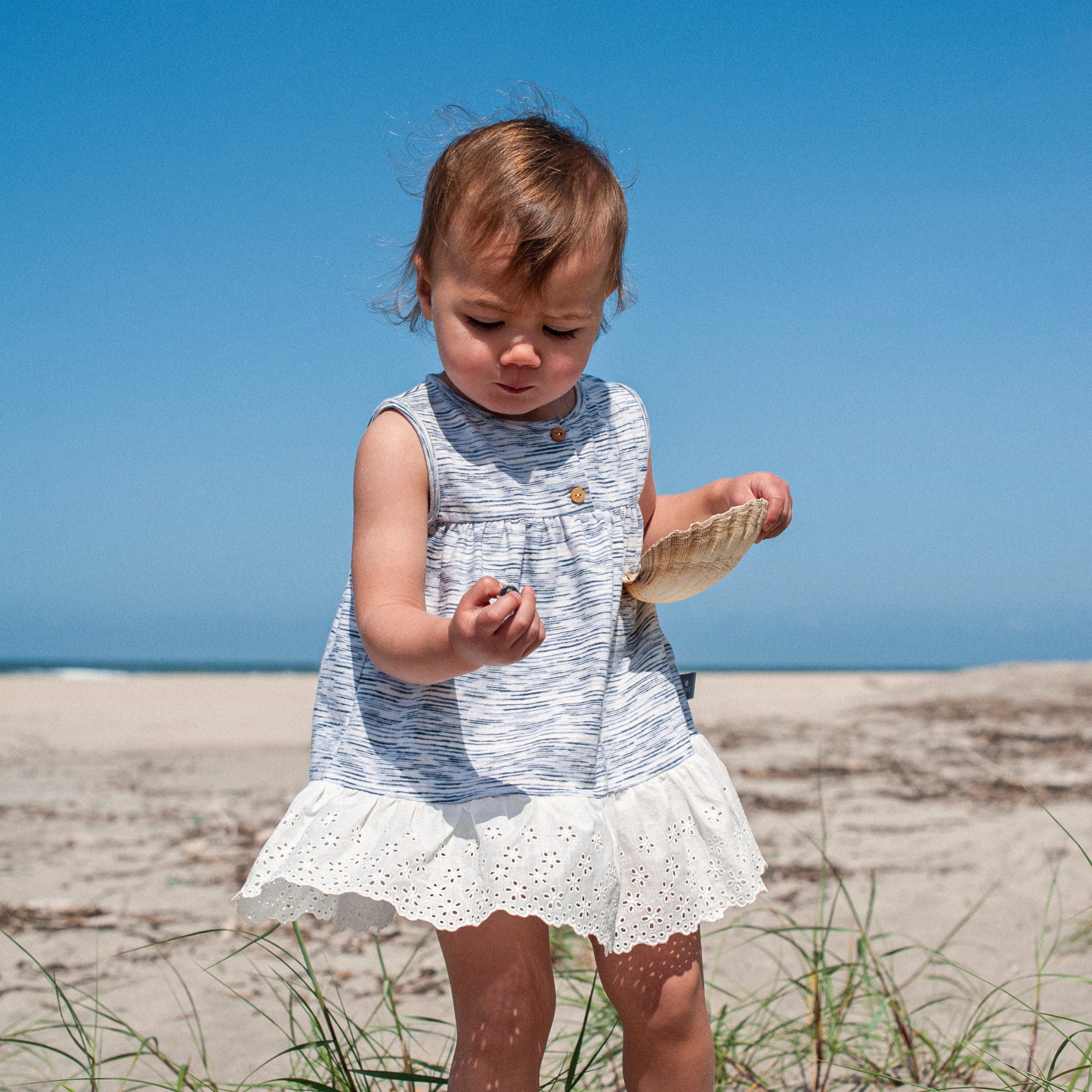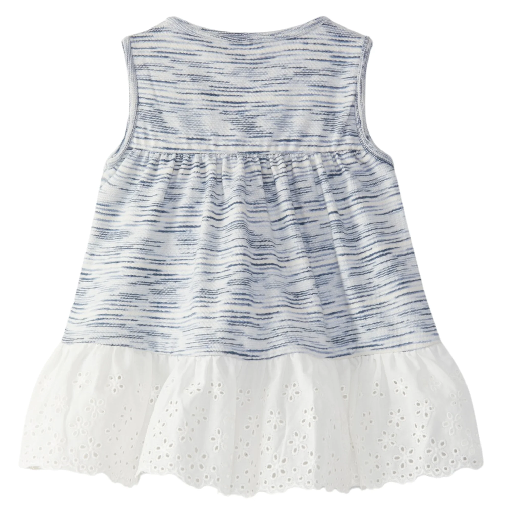 Abito in jersey di cotone e lino con orlo in sangallo. Si chiude con bottoni in legno sul davanti.
