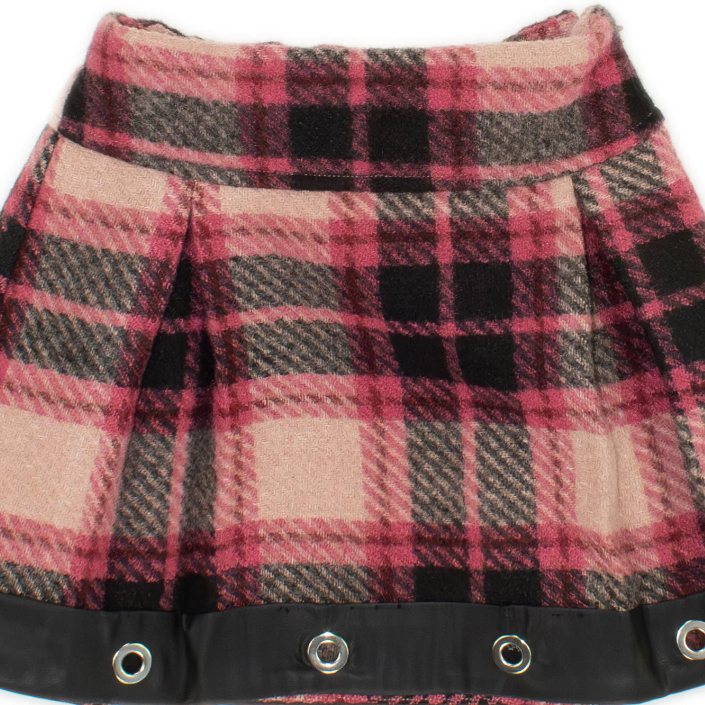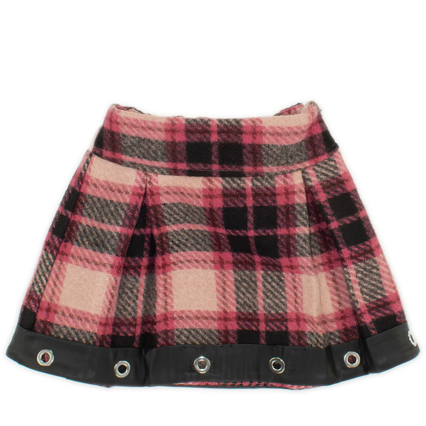Y-Clù gonna bambina in panno a quadri rosa nero Chiusura con zip laterale Fondo in ecopelle con dettali borchieComposizione: 100% poliestereMade in ItalyColleizione Autunno Inverno Vestibilità:Taglia Età