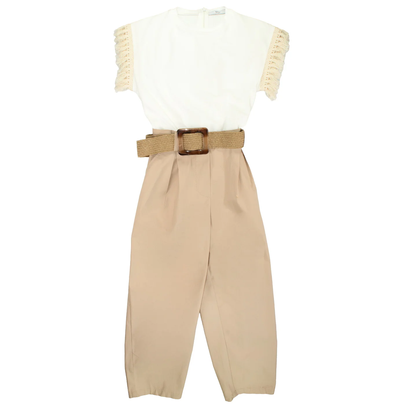 Y-Clù tuta intera girocollo bambina in cotone bianca beige Maniche corte con dettagli in nappine Vita con passanti e cinturone Tasche a filo Chiusura sul retro con cernieraComposizione: 100% cotoneMade in CinaCollezione Primavera Estate Vestibilità:Taglia Età