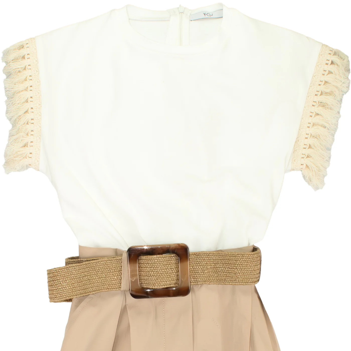 Y-Clù tuta intera girocollo ragazza in cotone bianca beige Maniche corte con dettagli in nappine Vita con passanti e cinturone Tasche a filo Chiusura sul retro con cernieraComposizione: 100% cotoneMade in CinaCollezione Primavera Estate Vestibilità:Taglia Età